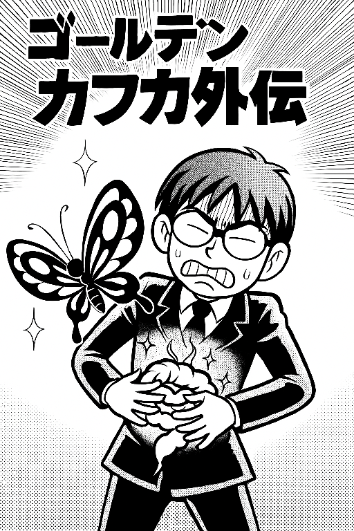タイトルは「ゴールデンカブカ外伝」でお願いと指示したのだが蝶だけに気を利かせてカフカに訂正されたのかなと⋯「今日は雨鬱のせいなのか腸のあたりが病んでねぇ。休暇を取っていたのでゆっくり休もうかなと⋯」「株価も低調ですからねぇ。上がったり下がったりのメリーゴランドで凪の状態でしょうか」「凪から腸へ、腸から蝶のように兆を目指して羽ばたくわけですね」「まさに蛹から蝶へのイナズマンですね、とゴウライは言ってのけます」蛹から蝶へイナズマン風に変身をイラスト化と指示をしたのだが⋯「鬱々ですぅ」「仮面ライダーに羽が生えた感じかしらぁ」「どちらかというとトンボに蝶の羽がついた感じのような。ちなみに『カフカの変身をイナズマン風に』と指示したらこんなイラストが⋯」「蝶の要素がどこにもないですね。テラフォーマーズよりキモいですし⋯」「タイトルと吹き出しも勝手に入れてくれたからね」「さすがAIコナン君というところかしらぁ」「いかにプロンプトを適切に行使できるかがAI時代を生き抜く肝になりそうですね」「人真似のプロンプトでは画一的で差別化のない結果となってしまいますからね、とゴウライは真面目に意見を述べます」「まさにマスター的ユニークなプロンプトなのですぅ」「褒められた気がしないなぁ。確かに競馬予想を皆が同じプロンプトで質問して回答を得たら当たっても1倍しか無いかもしれないね」「当たるとは限りませんしね。自己責任ということで終わるわけですね」現時点ではゴールデン株価とはならず。昨日のオールカントリーはマイナスだが宇宙関連投信は割と上がっているし。個別株も一方は上がり他方は下がるのシーソー状態(メリーゴーランドではない)まぁ下がれば買い増しチャンスと捉えて取らぬ狸のなんとやらと⋯。さ〜て、お腹の調子もまだ戻らないがこれだけはAIコナン君に質問してみよう。マスター「この世で一番美しいのは誰?」AIコナン君「面白い問ですね。個人の価値観や時代・文化により美しさの基準は変わるので決めることはできません。あえて回答するなら『それを決めるのはあなたの心のなかにあります』でしょうか⋯」マスター「なるほど、まぁ質問自体が冗談だけどね」AIコナン君「冗談ですか。笑えないですね」う〜む、AIコナン君との問答集を出してみるのも⋯。イナズマン VOL.2 [ 伴直弥 ][新品]テラフォーマーズ (1-23巻 最新刊) 全巻セット変身 (新潮文庫 カー1-1 新潮文庫) [ フランツ・カフカ ]