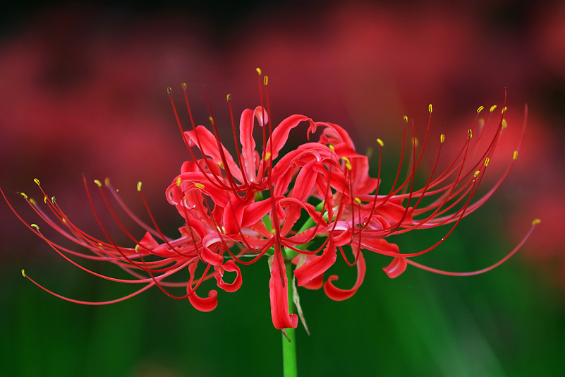 彼岸花の名は秋の彼岸ごろから開花することに由来する。別説には、これを食べた後は「彼岸(死)」しかない、というものもある。別名の曼珠沙華(まんじゅしゃげ)は、法華経中の梵語に由来する)。又、"天上の花"という意味もあり、相反するものがある。異名が多く、死人花(しびとばな)、地獄花(じごくばな)、幽霊花(ゆうれいばな)、剃刀花(かみそりばな)、狐花(きつねばな)、と呼んで不吉であると忌み嫌われる事もある。園芸品種には赤のほか白、黄色の花弁をもつものがある。また、韓国では彼岸花のことを「相思華」ともいう。「葉は花を思い、花は葉を思う」という意味である。彼岸花(桃太郎公園)