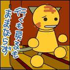 電車に乗ってちょっとそこまでおでかけしてきました。 とら太を膝の上に前向きにだっこしていたら 向かい側に座ったサラリーマンがとらを見て にこにこしています。 珍しくおじさんに愛想を振りまいてるのか?と とら太の表情を覗くと相変わらずの仏頂面。 なんなのよあんたはもー。 せっかく笑いかけてくれてるんだから 少しくらいにこーとかしなさいよー。 父と同年代の人っぽかったから こども好きのパパさんだったのかもしれません。 すみません、無愛想で。 その後エレベーターに乗り合わせたおばちゃん3人組には 何故か目があっただけで大爆笑。 こいつめー!