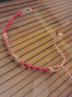 今日からちゅんは、始業式で年中組さんになりました心機一転!という感じで、朝から自分で着替えてしまって、自分でもお兄さんになる事を意識してるみたいです・・・素晴らしい!!いつもこうだと良いのに~。*登園してみると、今までちゅんの先生だった先生は年長組さんになってました。幼稚園では会えるんだけど、ちょっとだけ寂しい気分・・・ちゅんの先生は、今まで年長組さんを2年?3年?連続で担任していた先生で、ものすごくシッカリしていて、ハキハキしているけど、気持ちが深そうな先生。怒られないように、頑張りたいと思います・・・親子ともども・・・(笑)*そして、始業式だけで半日で帰ってきたので、お昼は幼稚園の近くのインドカレー屋さんで、お友達のSくん達と食べました普段は夜しか行った事がないので、ランチのあまりの安さにビックリしちゃいました。今度から昼なら、ちょこちょこ行けそう~。そして、帰りSくんがウチで遊びたいと言うので、Sくんのママの仕事が4時からなので、それまでねって事で遊びに来ました。Sくんは、どうやらウチにある、剣のオモチャなどがお目当てだってSくんのママから聞きました^^ 好きだよねぇ~男の子・・・ちゅんにしたって、あたしたち親は買ってあげたことないんだけどねー。それでもバァちゃんが買ってあげるから選びな~って言うと、必ず、こういう戦隊物のオモチャを選ぶ。。。*そして、Sくんのママが最近ハマってるという、ヘンプで編んだブレスレットを教えてもらいました簡単そう~と思っていても・・・やると難しい!ヒモをどこに通したらいいか分からなくなったり、手が痛くなったり、肩がこって、背中がバキバキに・・・・・・でも、あまりの面白さに(あたしは単純作業が好き。笑)一気にやり終えてしまいました。ちょうどSくんのママの仕事までに間に合って良かった~!途中で中断すると、続きが気になって仕方ないもんねこんな感じに出来ました~!*そして、さっき近所に住んでるTくんが遊びに来たので、通してあげたら・・・最近1年生になったばかりのTくん。学校が楽しいようで、お友達を連れてきました。でも、外は雨・・・雨の中遊んでいたみたいで、2人はベタベタ~~~雫は落ちてるし、靴下もベタベタで歩いた跡がついてるし~。「とりあえず脱いで遊びなよーー」と言ったら、お友達が急に不安になったのか、「やっぱりオレは外で遊ぶ!」と言って、出て言ってしまいました。Tくんは、ちゅんのオモチャで遊びたかったみたいですが、結局お友達がいってしまったので、Tくんもお外へ・・・Tくんと遊べるって思っていたちゅんは、半べそ~~~*でも、これからこういうことって多いのかな?Tくんが知らないお友達を連れてきたり。。。そういう時って、やっぱり家に上げてあげたほうが良いのかな?でも、なんとなく知らない子を家に上げるのって抵抗があるって言うか・・・そして、お腹減ったって言われたら、オヤツとか出してあげるべき??オヤツを出すのは、嫌ってわけではないんだけど、よく知ってるTくんに出すのはともかく、知らない子にはどうしたら??1回出しちゃうと、それから当てにされちゃっても困るし。。。小学生のお子さんがいるママたちって、どうなのかな~?と思って、今日は考えちゃいました。
