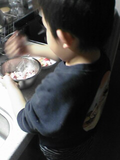 ちゅんと、イチゴ白玉を作りましたちょっと春らしいでしょ??・・・そう言えば、またこちらの書き込みシステムが変わりましたね。新しい物好きの、ミーハーなもんで・・・今回は、中央寄せで文章を書いてみました。*ところで、イチゴ白玉。白玉粉に、イチゴを小さく刻んだ物をそのまま入れて、フォークで潰してひたすらコネコネコネ・・・・・すると、とてもキレイなピンク色のかたまりになりますちゅんが、コネコネしてくれました *そして、1つづつちぎっていって、好きな形に丸めたら、お湯へポトン!と入れて、浮いたらすくってお水へ・・・ちゅんは「ハートを作るの~」とか「これはウンチ~」とか言って、色んな形を作って喜んでました(笑) *そして、完成~~~とってもキレイな色合いの、美味しそうな白玉が出来ました。早く食べたいちゅんにせかされて、器に、バニラアイスと、茹であずきを盛り合わせて、イチゴ白玉が完成~~ *気になるお味は・・・・・・う~~~ん・・・見た目はキレイで可愛いけど、やっぱ普通の白玉の方が美味しいかな(笑)ちゅんも、早く食べたいってうるさかったくせに、いざとなると、アイスばっかり食べて結局イチゴ白玉は残してしまいました・・・これは、茹であずきとか乗せるよりも、イチゴソースとかで味付けした方が良かったかも・・・ちょっと苦味が出ちゃった*昨日は更に、ケーキも焼いてみたんですが、長くなったので、また明日UPしますね