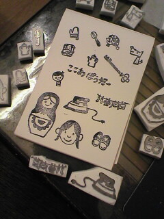 今日もやっぱり、調子いまいちな感じだったちゅん。触るとちょっと熱い気がするし・・・どうもスッキリとは治らない。。。でも、お薬を3回きちんと飲んで効いてきたのか、食欲は結構出てきたし、遊んでいても鼻歌も出てきたりしたので、結構回復はして来てるかなー?って感じですが。明日も家にこもってても治らなさそうなら、やっぱり月曜日はお医者さんに連れて行こうかな~って思ってます。*というわけで、お家にいるので・・・今日も気になっていた下駄箱や玄関クローゼットのお片づけ、山椒の鉢変え、オヤツもポテトチップや揚げ餅を作ったり・・・はんけしも色々彫ったりして、何かとはかどりましたこの1週間くらいで彫ったやつです。1番下の真ん中の女の子の顔だけのものは、友達Aのとこの、お姉ちゃんAちゃんがデザインしたものです。小学校1年生で、このデザイン・・・将来楽しみですね~♪可愛かったので、彫らせてもらいましたあと、真ん中の”ここあぱうだー”という文字は、友達Aが巾着などを作り、あたしがそれにハンコを押して、いつか売ったりお店を出せたらいいね~^^なーんて2人で夢を語ってる時に、お店の名前を考えた時の名前です。いつか実現できると良いな~。そのためにも、頑張って彫りま~す♪*そのほかのものは、こまけいこさんの本から頂きました。こちらの本には、消しゴムハンコの彫り方から、色んな使い方まで載っていて、とっても参考になりますこちらの本に載っていて、絶対に彫ってみたかったのが、真ん中右くらいの、細かくて分かりにくいですが・・・洗濯物を干してあるデザインです。これ、可愛くてやってみたかったんだ~。案外うまくいったので、どこに押そうかなって楽しみ・・・。アイロンなどは、すでに押してみました。こちらも、友達Aがスタバのマグを入れるように作ってくれた巾着ですこんな感じで商品に出来たらステキだなぁ~