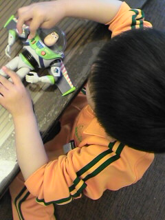 今日は幼稚園の体操教室があったので、3時半にお迎えに行き・・・そのまま友達A宅へすでに学校から帰っていたAちゃんと、幼稚園から帰っていたSちゃんとオヤツを食べて、遊んで帰ってきたのですが。。。今日はAからビッグプレゼントをもらったちゅんずっとAの宝物だったそうなのですが、ディズニーキャラのバズ大好きなAが持ってたバズのお人形。と言っても、ただのお人形じゃなくて、ボタンを押すと色んなことを言うんです。「私はバズライトイヤー」「平和を守るために来た」「危険を感じる!危ない!」とか・・・永年地球を守ってるちゅんの好きそうな言葉を(笑)こんなステキなお人形です。ホントは箱に入ってるのを撮ろうと思っていたのですが、すでに車に乗ってすぐに気づき、自分で持って降りちゃって・・・あたしが家に入ったときには箱から出ちゃってました「もうすぐ、こどもの日だしあげる~」と言っていたAの言葉をくんで、こどもの日にあげようかなーと思っていたのですが・・・とてもムリでしたでも、ありがとう!寝てる今も抱っこして寝てるよ・・・(笑)*そして、ちゅんのスイミングですが。今週から開始したスイミング。水曜日に決めたので、今週も水曜日に行って来ましたちゅんは、水に顔をつけられないので、プールに上げ底をしてある、1番下のクラスですが、なんと!この前体験の時にお世話になった先生のクラスでしたとーーーっても優しそうな女の先生で、何かをする時にも、ちゅんがイヤイヤをすると、抱っこしてやってくれるような先生・・・そしてゴルフボール拾いをやることになったのですが、いくら上げ底がしてあるとは言え、ちゅんにしてみれば腰よりも深いプール。とても潜らずには取れそうもないのですが・・・小さなボールみたいのが大好きなちゅん、頑張りました・・・とは言っても、潜ったんじゃないんですよ??どうやってゲットしたかと言うと・・・。プールの中で、両足でボールを掴み。ススス・・・とプールのはしまで持って行き・・・プールの渕につかまって、両足を上げて・・・プールの外にボールを出すすっごい長い間格闘して、ゲットしてました。何回失敗しても諦めずに・・・(笑)・・・ずっと気づかなかった先生も、やっと最後の方でちゅんの格闘に気づいてくれて、笑いながら足で挟んでるボールをちゅんに渡してくれて、2個ゲットそして、このクラスは前回体験した時よりも、大人しめの子が揃っていたようで、結構ちゅんより大きそうなお兄ちゃんもいて、潜って取ったボールをちゅんにくれたり。。。(前回は、ちゅんよりも小さそうな子がバンバン潜ってた)なんだか見ていて、とても微笑ましいクラスでした。こうやって水に慣れていってくれれば良いけど・・・*・・・と、ここまで書いて、さっきちゅんが「おはよぉ~~」って起きて来てしまったので、皆さんのトコへは明日(って言っても今日か)伺います~。ゴメンね