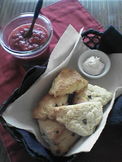 今朝になって、ちゅんのお熱もずいぶん下がり、ボツボツもますます増えてきて、水ぼうそうっぷりが上がってます今日も監禁生活って事は分かりきっていたので、昨日の夜、ちゅんが寝ているすきにスーパーへ半額になっていたイチゴがあったので、ゲットしてきて・・・早速今日はイチゴジャムを作りましたかなり美味しい感じに出来たので、イチゴジャムに合わせて何か・・・と思いましたが、リッツくらいしかなくて、それじゃー寂しいな~ってことで。*しまりすちゃんがスコーンを作っていたのを思い出し。早速チャレンジしてみました・・・とは言うものの、小麦粉もちょっと足りなかったので、ホットケーキミックスで作れないかな~?と探してみたら、ありました~ちょっとレシピを載せておきたいと思います。*材料*・ホットケーキミックス1袋(200g)・バターorマーガリン(40g)・牛乳(85cc)(バターは、有塩でも良いらしいですが、ちょっとミックスとあいまって、くどい感じになるかも・・・というあたしも、ちょっと無塩バターが足りなくて、有塩を足しちゃったのですが)*作り方*・オーブンは180度に余熱。 その間に生地作り。・ミックスをボールにあけ、冷蔵庫から出したてのバターを入れ、 スケッパーなどで切り込む。(あたしはヘラとバターナイフでしました)・更に手早く、手で生地を細かくポロポロからサラサラにし、 冷たい牛乳を一気に入れて、一まとめにする。・打ち粉をした台の上で4,5回折りたたんで (チョコなどを入れたい場合は、この時に一緒に練りこんでいく) 伸ばしてから、三角など好きな形に切る。・180度に熱したオーブンで、10~15分くらい焼く。以上で完成で~す今日は、クリームチーズがあったので、それとイチゴジャムを添えました。ちゅんも「ラーメンが良い~」なんて言ってたのに、スコーンの良い香りがしたら食べたくなったようで、しっかりジャムを付けて食べていました*そうそう・・・ちょっと前に、口が広くて浅いブリキのバケツ?に植え替えたクレソンですが、元気にスクスクと大きくなりお花が咲きました^^クレソンって、こんなに早くお花が咲いちゃうんですね~早く食べないと・・・!でも、白くて小さいお花なので、見てるだけでも可愛い食べちゃうの、勿体無いな~。もう少し見ていたいな。