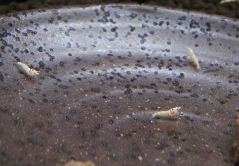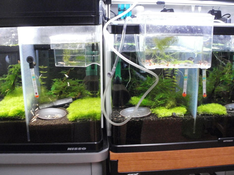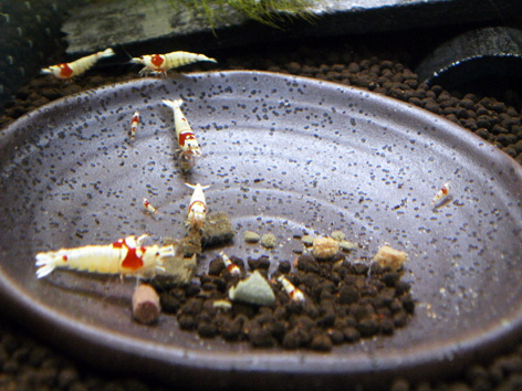 稚エビもだんだんと大きくなってきました。餌場に寄ってきています。柄もはっきりしてきて、選別までもう少しかな と思っていましたが、さらにミクロ稚エビが・・・もう少し様子を見ながらの選別になりそうですが、産まれた時に仕切りの隙間から移動するらしく、いろいろな稚エビが混在??時間をかけて選別するしかないですね。水槽ごと分ければよいのでしょうが、それも大変なので仕切りで様子見が続きそうです。話が変わりますが 先程、里子が無事との報告がきました。初生体発送、大丈夫で安心できました。