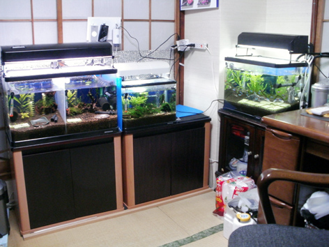 チャームさんより父親の60cm水槽が届いたので、配達の名目で写真撮ってきました!!!早速、水槽の並んでいる状態です!!!以前は私の部屋でしたが、今では父親の趣味がギッシリ、一眼レフのデジカメ・パソコン・テーブルもカリモクその他いろいろ詰まってます。今回の60cm水槽は中央の水槽サイズUP用です。水槽の様子ですが、右のプログレ450CO2添加有りで水草とネオンテトラ eitaroさんより頂いたリシアは先日浮き出してセット直ししたばかりでした。(残念)スネイルと大格闘中!!中央の小型水槽はホームセンターのレッドビーが増殖!!残念ながらバンドメインになってます。ウジャッとしてますが、最初のビーの購入時に自分で選ばなかったのがミスですね。バンドの爆殖と格闘中!!!左の水槽は仕切の右側が私からの里子やお気に入り仕切の左側 表現系を私が手放さないのでオークションで格闘しなから入手した表現が入ってます。父親 自慢の表現系レッドビー柄もですが、白赤のコントラスト 厚み 良い出来になってます。現在、表現系親個体4匹 抱卵の落札でしたが表現の稚エビが2匹程 計6匹たまにオークションを見てウズウズしている父親がいます。表現系の繁殖と格闘中!!!今の父親の悩み ホームセンターのレッドビー 水槽入替えの為の移動みたいです。父親水槽のお披露目でした!!! 200hiace