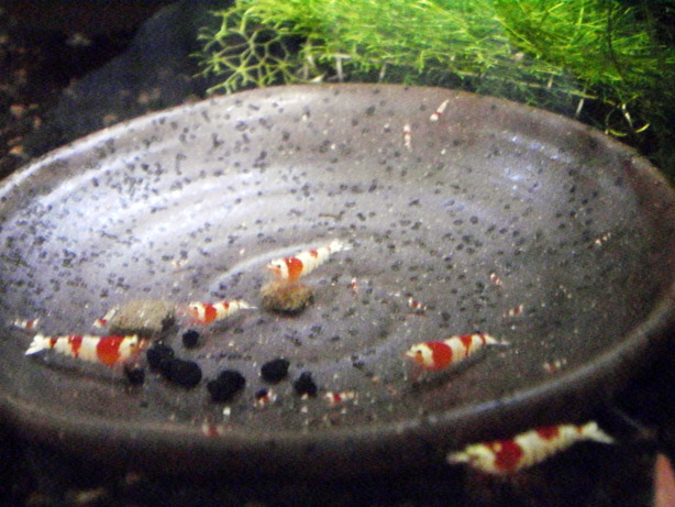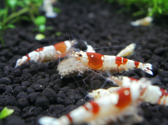 タイガー以下の水槽の餌場の皿に稚エビたちが集まっていました。なぜかこの水槽が一番生存率が高い感じで、水草や奥にあるモスにもたくさんいます。あまり手を入れてない水槽なので、それが良いのかもしれません。選別からおりてきたビーですが、産まれた稚エビの中にはそれなりの柄もいますが、やはりタイガーが多いですね。まだまだ全体的に抱卵進行中!! 最近は連日のようにどこかの水槽が舞っています。現在のレッドビーの匹数もですが、抱卵個体までもカウント不可能となってしまいました。(汗)