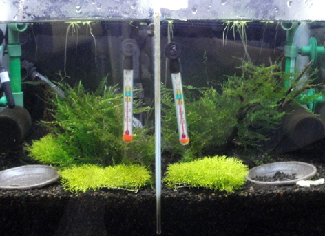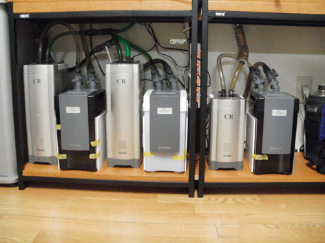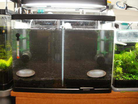 昨日よりはじめたリセットがやっと注水まで完了!!稚エビ救出の為、いつもよりかなりの時間がかかっています(汗!!)水を2回程入替てフィルターON!! そのときの写真です。昨日も書きましたがソイルはマスターソイル ノーマル と プラチナソイル パウダーの組合せ底面マルチベースフィルターから外部SV4500直結のスタイルです。今回は他にも時間のかかる原因があり、それは水温対策!!クールタワーの設置です。意外とホースを触ると時間がかかってしまいます。同時に今回リセットのプログレ450と隣りの60cm 2本の水槽に取付ました。ホースが見苦しいですね(困)プログレ450にテトラCR-3 冷やし過ぎが怖いので逆サーモ併用です。プログレ450用のCR-3は旧型で175Wタイプ 逆サーモの容量が200W迄なのでギリギリに近い状態60cm用のCR-3は245Wタイプなので、逆サーモは使用できずヒーター併用でしばらく様子を見ます。マルチ水温計のMAX水温が26.7度になっており、慌てて60cmもクールタワー設置となりました。ちなみに60cm水槽のクールタワー稼働前の水温が26.3度 1時間以上かかっていますが現在は25.1度効果は出ているもたいです。あとは水草水槽へCR-2を逆サーモ併用の設置をしなければ・・・今年の夏はちょっと電気代が怖い気がする 200hiaceでした