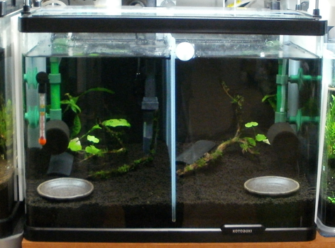 昨日レッドビーシュリンプ投入の水槽を見るとセパレーターの左しか入れてないのに・・・右を泳いでいます???観察すると水位を高めに設定した為に、奥の方を登って隣りへ・・・なんとかしなくては!!作戦開始!!標識を造ろうかと思いましたが、エビには効果がなさそうなので造作!!余っていた材料を見つけてカットして早速準備両面テープで小さな方を足として着けてこの状態早速セパレーター上へ設置・・・完成!! と思いきや・・セパレータとの間に隙間が エビさんは通れます(進入禁止が入っているのに・・)さらにスポンジを着けてみましたセパレーターに乗せると!!おっ!! なんとかなりそうです(嬉!!)上から見るとこの状態で明日まで、様子見になってしまいました。今日の引越は残念ながらお休み(涙)この水槽の様子です現在12匹 みんな元気!!近寄ってみると光量の多い水草水槽にいたのもあり、全体的に色が出てます。明日、脱走組がいなければ、選別引越再開予定ですが・・・うまく行きますように!!(祈)結局、エビに遊ばれているhiaceでした(疲~)本日の苦労を元気に変える ポチ おねがいします!!にほんブログ村