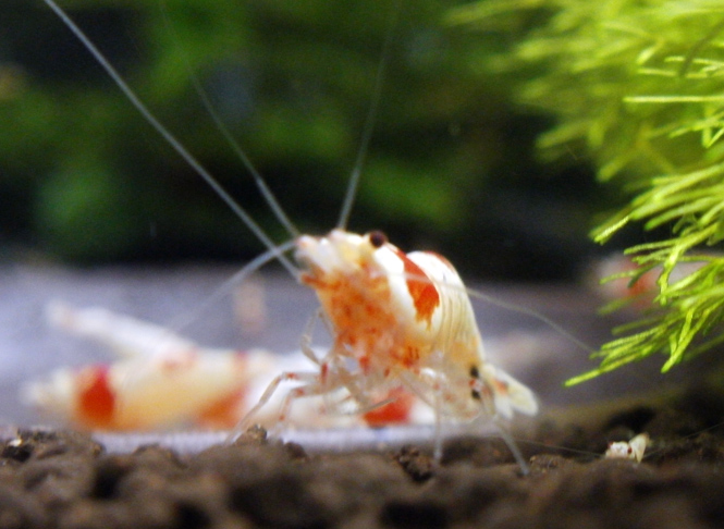 今日の満月に合わせ脱皮の後が数カ所にあり、抱卵個体が増えています。脱皮の跡と抱卵個体のショットでした!!現在も舞っている状態が続いてますが、近くにきた個体を写真に撮ってみました。色の薄めの個体ですが抱卵すると奥に隠れる傾向があり写真は難しいですね見える範囲の抱卵個体は現在9匹 まだ隠れている可能性と明日の朝どうなっているかです稚エビたちもだいぶ大きくなった個体や産まれたばかりの個体 様々だいぶ にぎやかな雰囲気になってきました。来週あたりに立上中の水槽へ選別を含めて引越が出来ればと思っています今週でどこまで成長してくれるかが問題です。