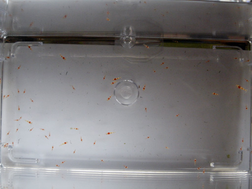 今日は仕事の段取りも良く、早めに仕事終了!!!(喜)暦通りの出勤なので やっと3連休です。以前 稚エビのUPをしましたが さらに誕生が進んでいるようです。モスラ&表現(喜)・進入禁止(並)・バンド&タイガー&白??(涙)赤足もしっかり混ざってますが、さまざまな個体が集まっています。前回の誕生で喜んでいた表現系も大きくなってきています。なんとか順調に育ってくれれば良いのですが(ファイト!!)今日は運良く、脱皮の瞬間とお腹の卵から誕生の瞬間を見れました。写真は無理でした・・・スミマセン見とれてました(謝)話が変わりますが 60cm水槽のガラス面に小さな点がポツポツと・・・ピンセットで突くと!! ぴょんぴょんと跳ねる様に逃げて行きます!!もしかして ミジンコ ?? (!!嬉!!) だと良いのですが 期待して良いのかな??期待残して、今日はここまで!! 200hiace