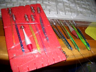 ヤリイカ釣りまで・・・あと1日仕事に行けば・・・今日も、何だかバタバタ、ばたばた・・・疲れた1日でした今夜は、イカ釣りの準備で、仕掛けを組んでいましたこんな奴で、イカを釣ります。しかし、ここ最近、水温の上昇で、イカが潜っているようです水深は、数釣り出来た頃は、70~120mでしたが、最近150~270mらしいです通常電動リールには、300m位しか糸を巻いてません錘も重いものを使っているようです。1日イカを誘うために、竿を持ってしゃくり続ける・・・はっきり言って・・・修行ですでも、止められません!!あのヤリイカの甘さときたら・・・今度は・・・何で食べようか? 深くなりすぎて、多点掛けが出来ないようです。まあ、大型のヤリイカなら10杯も釣れれば食べるに困りませんけどね・・・20杯程度、釣れれば良いなぁ~