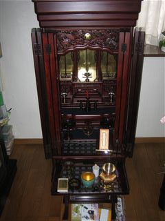 今日の写真は、四十九日法要前の仏壇この時点では、ご本尊が(浄土真宗は、阿弥陀如来、親鸞聖人、蓮如聖人)入っておりません。また、お花や過去帳、土香炉にも灰は、入っていません。ご法要後・・・また、お寺さんに頼んでおいた本山からのお軸3枚が入りました。仏飯器にもご飯、お供え、花等・・・仮祭壇にあった、品々を移動させました。当日に、『入仏式』を行えれば良かったのですが、お坊さんの都合により、5/18(金)に決まりました。少し日数が空きますが、あまり拘らないようです。 皆さんも、困ることの無いように・・・一度、いろいろお調べになることをお勧めします。・・・合掌