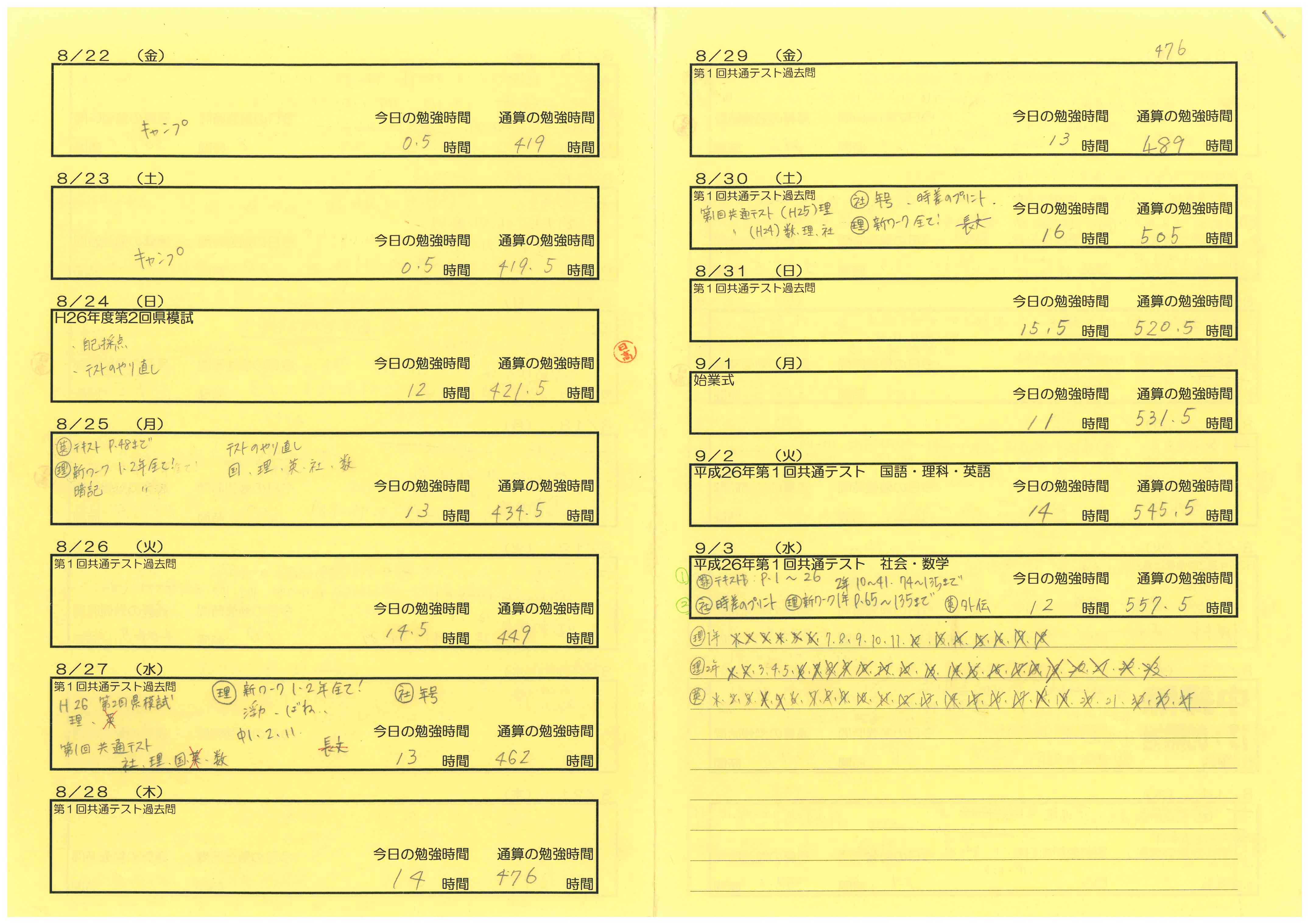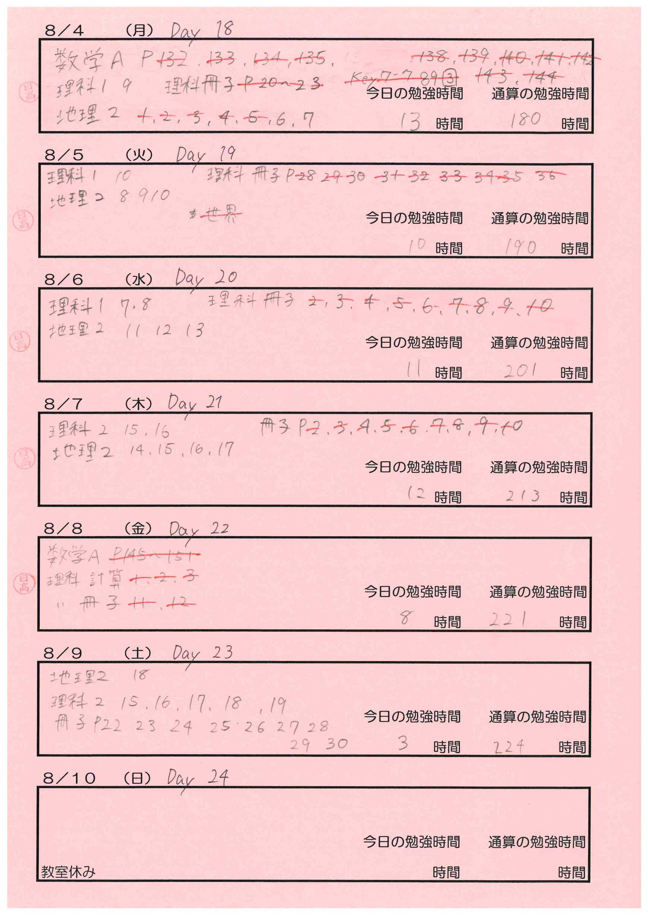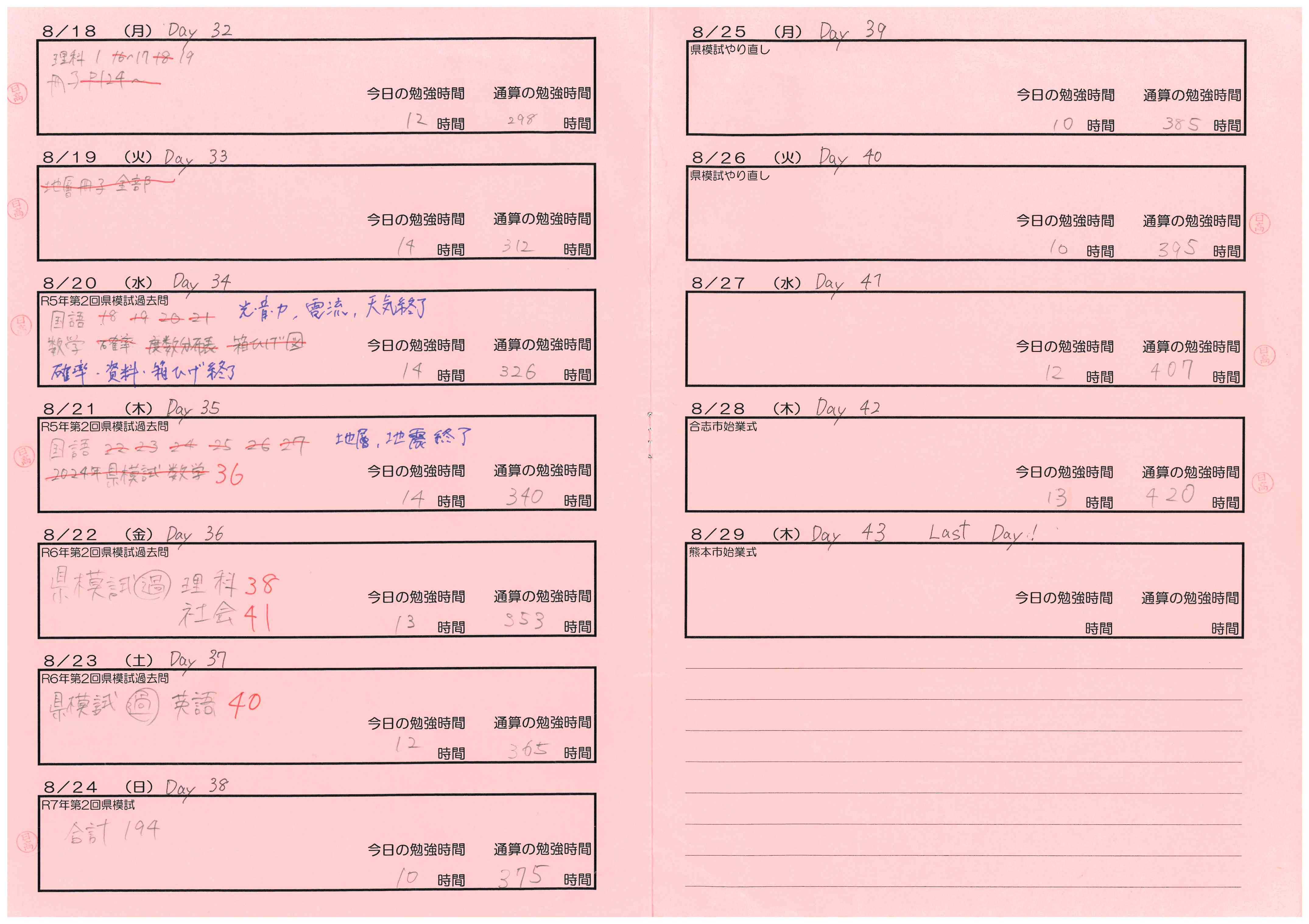 プロ野球セリーグで昨年までT監督の下で3年連続最下位でリーグ優勝は10数年前の落合監督の時代まで遡る中日(ちゅうにち)ドラゴンズのことではない。中日(なかび)と読む。大相撲でいうと8日目の日曜日。7/19から始まった夏休み熊本市は8/28まで全部で41日間。8/8がちょうど中間の21日目で中日となる。折り返し地点で200時間の学習時間を超えていれば目安となる夏休み400時間学習に到達する。当然時間ではなく「何をどれだけやったか」のほうが重要になるがそれなりの時間を費やさねば効果は出ない。この生徒は8/8時点で221時間学習で80%程の進捗。大量の課題の管理が難しくなるので毎日記録して終了したら消す。全部終えることができるかは日曜や盆休みにかかっている。今年の中3夏期講習の記録用紙はピンク。ただ単に在庫が一番多かったから。紙類が大量発生する時期なので見つけやすい色紙を使う。8/8の中日に中3に聞いてみた。「今日が夏休み中間地点だけど 何が出来るようになった?」「数学の関数ができるようになった」「歴史の流れがわかった」「動物と植物を覚えた」色々言っていたが一番良かった言葉は「毎日10時間勉強する習慣ができた」今までの自分の限界を超えた努力が当たり前になる。するとそこから更に自分の限界点が上になる。「閾値(いきち)を超える」さあ、残り半分!ひかりゼミHPはこちら