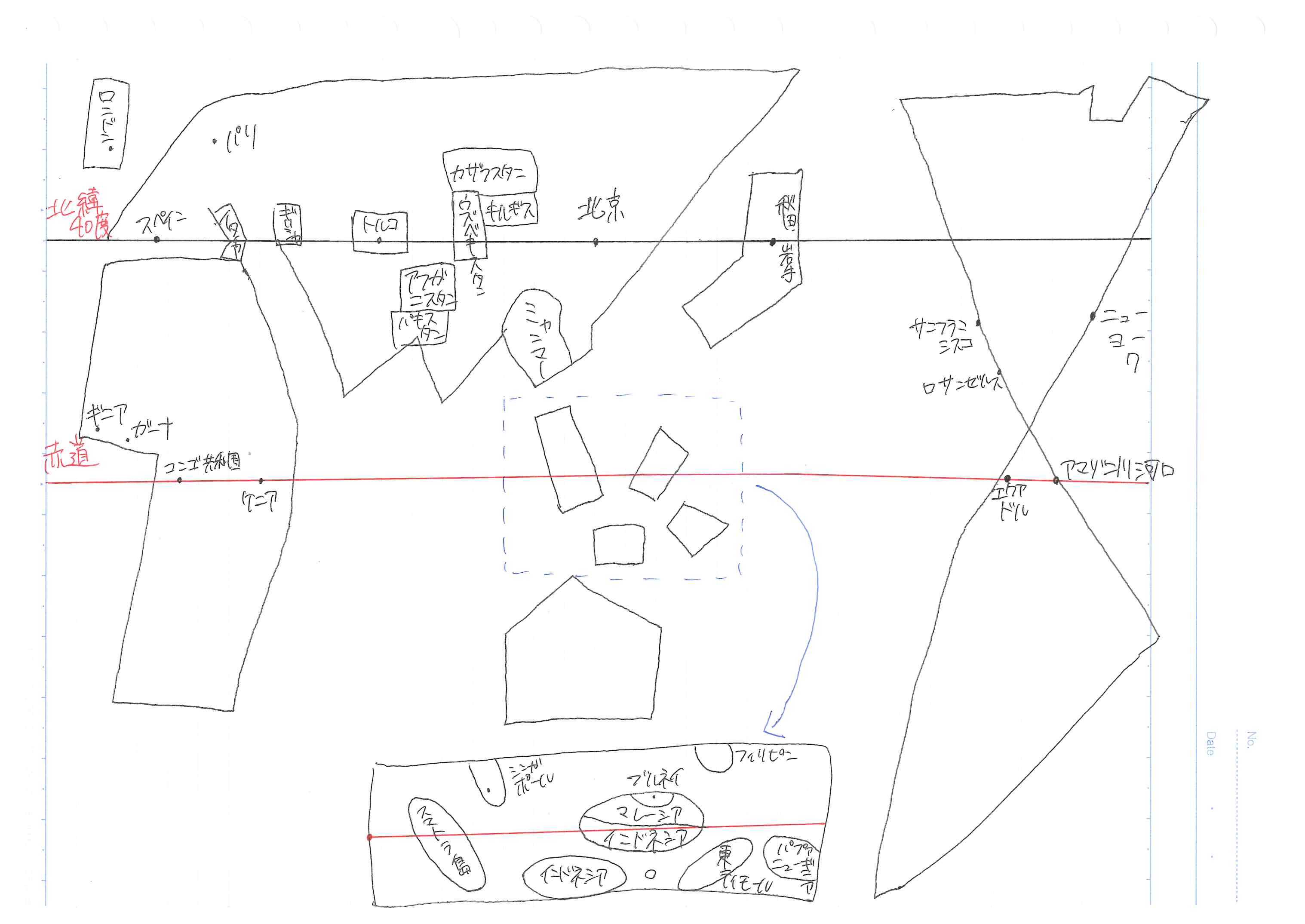 中3はノートに簡単な世界地図を描かせている。必要な内容は北緯40°の緯線と赤道そしてその周辺の重要な都市名。赤道はシンガポールとアマゾン川河口を通る。北緯40°は秋田岩手と北京、スペイン・イタリアワシントンとニューヨークの間サンフランシスコの上を通る。中3で受ける試験で時々出題される。生徒の一人が描いた地図がこちら。「カザフスタンとかウズベキスタンとか キルギスとか要らないだろ!」と突っ込んだら「カザフスタンとウズベキスタンと キルギスが好きなんです!」と言ってきた。イスラム原理主義者シーア派の中学生かとも思ったがどうやらTV番組の影響らしい。アルジャジーラ(中東の放送局)ではない。日本国内のお台場の色々と問題があったTV局の番組。平成から放送されていた旅行しながら恋愛するっていう番組をネ〇フリで見てるらしい。「面白いですよ!」夏休みの中3の息抜き程度なら…「シーズン1で22話あります」そんな長いのかよ!?「シーズン2も見ました!」夏休みの中3だろ!?何やってんだか…「集中できないときは ネット見ながら勉強してます」それは勉強してるとは言わない!!いや、明るく元気でイイ子なんだけどね…Wikiで調べたら2000年から放送されたあい〇りは久本さんや今田さんが出演したヤツで30分で400回以上あるようだ。そこにはトライしないで欲しい。ひかりゼミHPはこちら