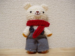 お友達にプレゼントしたしろくまくんです。男の子のママさんなので、男の子にしました。冬で寒そうだったから、赤いマフラーをつけてあげました!MIYUママのHP、『しゅうたろんち』にも遊びに来てね!
