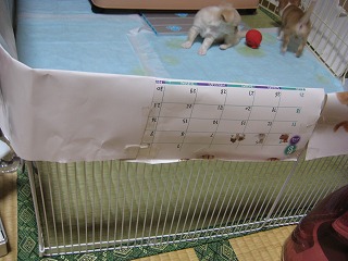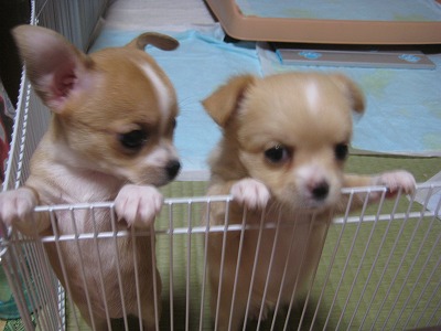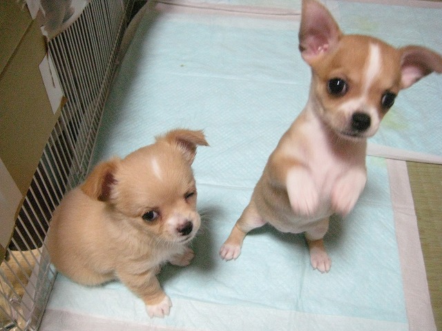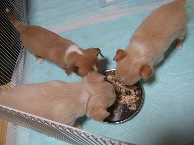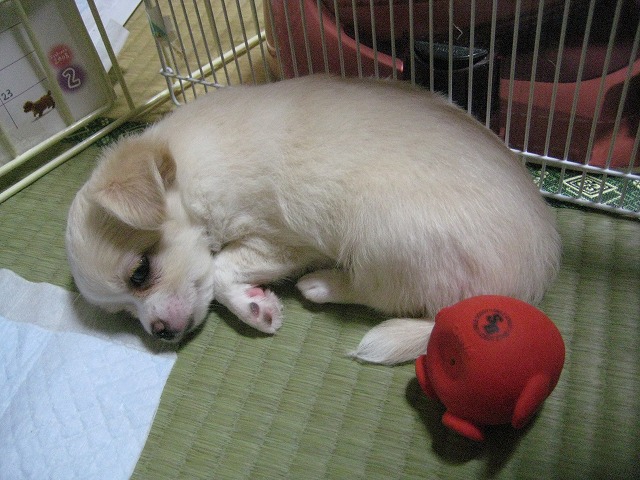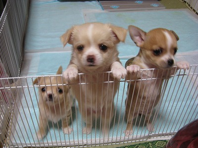とにかく、みんなで(&ちかも)遊び、離乳食もどんどん食べるようになりました。先週の金曜日、狭い部屋に子どもたちのスペースを作って引越しました。このスペースの脇にあるテーブルは、人に見せられないほど・・・・。寝るのは、端っこ。 ケージの下にキャスターが付いているので、これを外に出しちゃおうか?と思いましたが、おき場所がない!それに、ちょっと段差があるとその脇で休む子どもたちがいます。そして、ちょっと遊園地気分!井草の部分も好きだし・・・・。ちかと一緒に朝、ご飯を柵の端っこでみんなで待っています。ちかと一緒にやっているのですが、ちかがまず自分の餌からササミをくわえて、この柵の中に入りました。それをまず子どもたちにやるちか!さすが、母親!トイレシートを替えるために柵の中に入ると、足にまとわりつく子どもたち。毎日、数回は、ひとりずつ抱っこして茶の間に連れて行きます。ちかの監視は付くけれど、焼きもちは妬かない。ちかを抱っこして「ちかが、一番可愛いんだからね!」と言い聞かせているからかな?そして、母に渡して膝の上に・・・・。(母も「だいぶ嫌がらなくなった」と)ちかのように、人も他のワンコも怖くない子どもたちになって欲しいから・・・・。