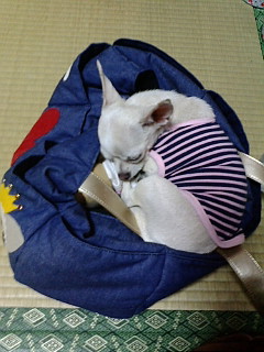 先週末から、不調で治療院以外のの外出を控えていたので、ちょっとストレス・・・・。暑くなりそうなので、9時過ぎにいつものけんしんと豆腐屋へ。今日のお供は、ちかとみいみ。銀行は、昨日の雷でオンラインダウンしたらしく、忙しそうだった。ここの制服は、明治調なので、羽織袴風なのだ!遊ばれても・・・・。みいみだもんね!残されたさきは、荒れたらしい。ケージから脱出。母は、ドアの鍵まで閉めていた。午後、訪問ナースの後に休憩と思っていたが、電話、来客、電話、来客・・・・休むのを止めた。そして、夕方行こうと思っていた、花屋へ早めに行くことにした。朝、留守番だったさきだけを連れて・・・・。(残念ながら、さきの場合、お洋服なし!!ちかに感づかれずに出ようと思ったので急いだから・・・・)花屋の方に触られるとビビって後ずさり・・・・みいみと違う。でも、今日は、ちかと一緒じゃないからかも?コンビニまで行き、花屋に戻り、そこでちょっと話していると寝そうになるさき。さきは、どこでも寝ちゃう・・・。(花屋にはカメラもたず自宅の写真でごめん!)家では、今度はちかが怒っていたらしい。帰宅後、さきはすぐシートにおしっこ!(ちかと一緒だ!)さきの方が大きく強くなって来たので、参ってしまうことも・・・・。だけど、こうやって楽しませてくれる。だけど、悩みは『お散歩』みんな好きみたいだ。必ずちかと子供がいいのか?(ちかと一緒だとちかの真似をするから無茶はしない・・・)。ひとりずつがいいのか?どうやっても2匹が限度。悩む!----------------今夜のカレーは、まずかった。辛いだけで、味がない・・・・。母が作ったのだが、とにかくルーが足りなかった?らしい。(買いに行く体力なし)私は、塩、コショウにしょうゆに、辛味を押さえるためにはちみつ等をかけて食べたが、これを夫さんが食べるか?と考えると・・・・。変わったものは食べないし、夫さんの好みは、Hバーモンドの甘口だったりする。私が、コンソメ3つ、塩、醤油、ソース、はちみつを加えてみた。夫さん、食べた!無理に感想は聞かず・・・・。エセ主婦の私・・・・味付けのごまかしは結構うまいかも?