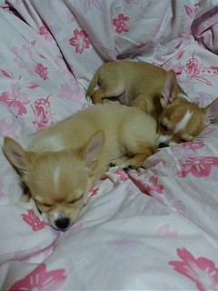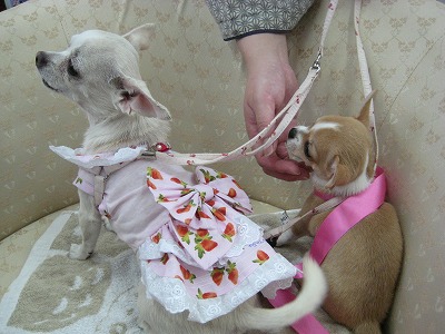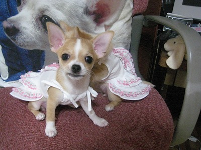 さきもみいみも75日(まだ、断乳できず。特にみいみが・・・)お母しゃんとお揃いだもんね!(ママが持っていた服を子どもたちにも作ってもらった・・・だけど、肩紐のお洋服はどう考えても失敗でしょう?引っ張り合いしてすぐ脱げる・・・)でも、誰もこっちを揃って見てくれない!!不調・・・・。コメント、ありがとう!!励まされてます!さきは、お昼寝していると必ず、側に寝ている子。静かだけど、みいみとやりあう時は強気!そっとついて来る。みいみは、食もいいしどこでも寝るし、誰にでも懐くと言うかすぐ人の足元でひっくり返ってお腹を見せる。あんたたち、悪い人だったらどうするのよ!だいぶ噛まなくなったと思っていたら、夫さんが躾をしていた。今のところ、ちかと同じように人懐っこい子たちだ。吠える子になりませんように!色々あるのね。試してみようかな?