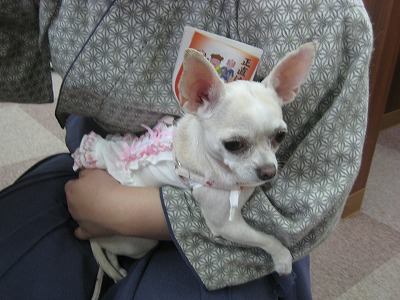 3ケ月に一度のリハビリに、苦手のS生会内科に行って来た。循環器の先生は、私が7年前の一月、いきなり「このままだと心不全、突然死」と言われてから、PMも入れてくれて、ずっとお世話になっている先生!(浜松市出身・40代)真面目すぎるぐらいマジメなんで、5月に行った時(ここに盛り上がった話は書けないってあるそれがこれから書く話)いきなり「妊娠しました!」と言ったら「おめでとうございます!」と言われた。いきなり、試した私も悪いけどさ。PMを入れた心臓は大丈夫かも知れないけど、骨とか年齢とか病気とか全体を見て、考えてくれーーー!と思ったのさ・・・・!だから、慌てて「私じゃありません。ちーちゃんです!」「あっ、ちいちゃんなの?」(先生ちょっとほっとした感じ)その時、私が「お腹に3匹います。でも、全部あげないといけないんです」と言ったら「一匹ぐらい残さないの?もったいないね」と言ってくれた・・・。あと「男か女かわからないの?」とも。(わかるわけない!!)先生は、犬も猫もOKだと言っていた。だから、ほんの一部のお友達に出している『ちーちゃん通信』を先生にも送っている。今回、福祉新聞と一緒にお送りしておいた。話題がチワワになると、いきなり「鹿嶋行っちゃったんだって?」と言ってくれた。ちゃんと読んでくれているんだ!と、とっても嬉しかった!「学会等の専門誌などの中に、息抜きがあってもいいかな?と思って送ってますが、迷惑じゃないですか?」と言ったら「ちゃんと読んでいるよ!大きくなったね」と言ってくれた。やはり、たまにこういう郵便物も悪くはないらしい。医者は、ひと月以上経つと忘れるらしいが、ちょっと前のことは、覚えていると聞いたがその典型かも知れない。「犬、飼ったことあるんですか?」「ある。でも、いると旅行とか行けなくなっちゃうんだよね!・・・・で、今日は、どうしてるの?」「母もいますし、ケージに入れても・・・・(そんな四六時中ついていないって!)」(手術前、犬の世話があるなら、早く帰ってもいい!と言ってくれた先生だし・・・)見せに行きたいけど、無理!でも、絶対にいつか見せたいなぁ!(応援してね!「はとちゃん、チワワを先生に見せてしまおうプロジェクト隊員募集」)受診後、新しく替わった看護部長にもご挨拶に伺えた。(福祉新聞の次号に、四川省大地震に行って来たナースに文章をお願いすることや今後のこともあるので、ご挨拶)疲れは、明日以降かな?これで、夏のイベント終わった感じ・・・・。今日は、早めに終わったので、涼しいし、花屋さんまで行った。ちかと玄関に出てきたみいみを乗せて。みいみ、膝の上から動かず!!「エライ!」と思っていたが、花屋に着いたとき、私の右膝はなんか冷たかった。チビられてしまったようだ。トホホ・・・・。ちびったみいみだもんね。