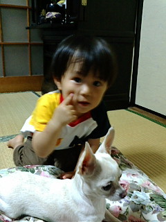 1歳11ヶ月の坊やがうちに来た。ちかは、子どもが来ると嬉しくて吠える!でも、それが面白くて、寝起きの坊やが笑った。しばらくするとちかも落ち着く・・・・。一応、さきたちも連れて来てみせる。みいみは、知らない人だと吠える。高い声で・・・・。さきは、後ずさりする犬なので、抱いていると黙っている。子ども達はケージに入れて、ちかを抱いたまましばらくお喋りを続けた。その後、ちかは、座布団に伏せていた。撫でる坊や。そんなに激しくないけど、相手はまだ2歳未満。こっちは、ちかが大丈夫だろうけど、何かしないかちょっと心配。あちらの親御さんは、ちかに坊やがなんかしないか逆に心配!だけど、ちかは、大人だし、坊やも腰のあたりを静かに撫でた。そして、一緒にパチリ!犬と子どもの笑顔は、みんなを笑顔にする!みいみクイズ、もういいでしょうか?明日あたり、発表しちゃおうかな?