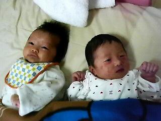 今日は、昼一に愛車CUBEの6ヶ月点検を済ませて、7日に出産したママ友『志保里』の所にお見舞いに行きましたご家族の方がいらっしゃったんだけど、私が来たら帰ってしまった悪いことしちゃったなぁでも、せっかく来たんだし、志保里のお母さんも一緒に5人でお話ターイム志保里の子『勝城』君は小さくてとても3490gで産まれたなんて思えないくらい悠哉も1ヶ月半くらい前はこんなに小さかったんだよねぇいつも間にかすくすく育っちゃって、勝城君の倍くらいの大きさがあったよまぁ、元気で何よりちゃんと出産祝いも渡してスッキリだしそのあと、First Friend記念に二人並んで可愛い悠哉は、ちょっとふてくされ顔、勝城君は、ほわぁんとすまし顔帰りに体重量ったら、ナントナント 5138gもありました服やスタイ・靴下を履いてたとはいえ、大きすぎだよどおりで最近また急にどっしりしてきたと思ったよ成長って早いなぁ最後に、志保里と勝城君へこれからも仲良くしてくださいも近いし、沢山遊ぼうね