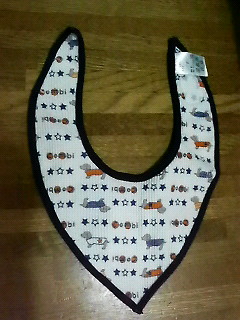 昨日のお約束どおり2枚目のスタイをアップしまぁすこれもリバーシブルタイプで生地もガーゼっぽい優しい素材で肌にもよさそうすぐ肌荒れしちゃう悠哉にはいいかもしかも、犬好きのパパ・ママだけあって、このスタイはお気に入り悠哉も気に入ってくれるといいな使用感はバッチリだけど、昨日のキノコもだけど少し小さいかな大きめバンダナスタイにしたらよかったかも