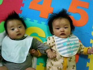午前中保育園に行って、お昼からは勝城君に遊びに行きましたまずは隣に並んで記念撮影腕を組んだりおをつなごうとしたり仲良しさんですが終わると2人とも腹ばいになって遊びました悠哉のが頭が大きくて重いやっぱりお兄ちゃんしっかり腕で体を支えて起こしてますおっとっと勝城君、体力の限界、ダウンですこの時点で悠哉 65cm・7300g勝城君 65cm・8000g1ヵ月半悠哉がお兄ちゃんなのに同じ身長、体重は抜かれています通りで勝城君しっかりしているわけだ産まれた時の体の大きさがこんなところに出てくるんだね悠哉、もっともっと大きくなろうね