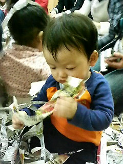 今日は、初めての保育参観日と言ってもつぼみ組は『親子ふれあい保育』っていう感じで、一緒に新聞遊びをしたりしましたいつもと違う雰囲気&ママがいるからか甘えん坊で、いつものやんちゃさが出てない様子普段の悠哉が見たかったのですが、しょうがないですねそれでも真剣に裂いたりちぎったりして遊んでますたまにはこんな風にやりたい放題させないといけないのかなお友達のRちゃんが一生懸命にミルク缶で遊んでいるのを羨ましそうに見る悠哉『貸して』の一言が出ない様子優しいのか、気が弱いのかお友達におもちゃを取られても、『あっ』とを出すだけでママに甘えてくる始末大好きなペットボトルのおもちゃを手にしても何か気が乗らない様子大きいお姉ちゃんに人見知りでしょうかまぁ、何にせよ悠哉の新たな1面も見れて良かったですパパが帰ってくると、じぃじからの追加プレゼントが届きましたブルーのカバーオールジャンパーはサイズが大きめなので来年に、フリースは風呂上りや保育園での上着にしようかな