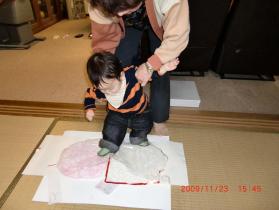 HAPPY BIRTHDAY 悠哉おめでとう早くも1歳になりました2009年11月23日わけあって12月1日の投稿ですが・・・。ファーストバースディなので、山口のばぁばと真由美ネエも招待し、お祝いをしましたまずは昔からの慣わし『餅ふみ』&『選び取り』餅ふみは写真のように中尾のばぁばに支えてもらったものの、嫌がり、ちょっぴりのっかただけ選び取りは、お財布・食器・電卓・ノートとペン・スケール・そろばん等を用意し、電卓と悩んだあげく、やっぱり食器に16時過ぎでおやつもまだだったからお腹空いてたのかなまぁ、何はともあれ『一生食べ物に困りませんように』(食べ物を大切にする(食い意地がある)から餅ふみ嫌がったのかな)そしてそして 記念撮影悠哉の産まれた16時12分こんなに元気に大きくなりました今日は悠哉もみんなもご馳走です大人はオードブル&刺身&鯛のお吸い物(ママ作)・お赤飯(ばぁば作)悠哉は手作りオードブル・タイのお吸い物・プチケーキ今日はなんだろうって感じな悠哉ですが、料理に興味津々今にもに取って食べちゃいそう17時前にお祝いスタートし、みんなでたくさん食べましたたくさんお話もして楽しかったね(じぃじは魚釣りで終盤に帰ってきましたが)パパ&ママ、真由美ネエから色々プレゼントをもらいご機嫌さん全部気に入った様子よかったぁしかも、山口のばぁばや、真由美ネエと仲良く遊んでくれた事もかなり嬉しいこれからもよろしくぅ1歳になって出来るようになった事1 コップで上手に1人で飲める2 スプーンで上手に食べれる3 一瞬1人立ち4 動物等の認識こんなところかな食べる事ばかり性格が出てるでも、ホントに大きな病気等(入院2回したけど)も無く元気に育ってくれてありがとうこれからもすくすく育って、たくさんたくさん遊ぼうね傑作出産祝いでもらった誕生日祝いグッズパパに着けてもらい記念にパチリ