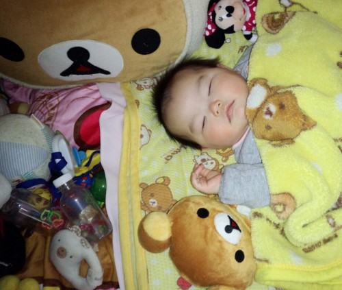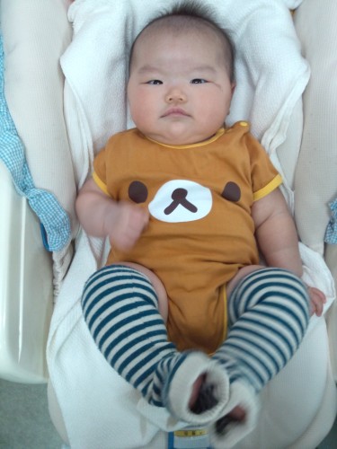 出産前に買っていたリラックマのロンパース80が無く、仕方なく70を買ったのですが半そでの為着れなくなりそうなので肌着っぽく着せてみたなんだかクマちゃんそのものって感じになりました