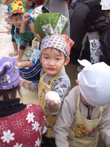 今日は保育園のお餅つきそんなに寒くも無く気候に恵まれました一生懸命に丸めています最初はぎこちなかった悠哉ですが、慣れてくると進んで手を出して丸めていました悔しかったのは合間に餅をつきに行った時、行くのが遅れて写真にも撮れず、見ることも出来ず今回は珍しくあの恥ずかしがり屋の悠哉が楽しみにしていたのか、一番手ぐらいについたようで一人でついたらしく、その姿見たかったとっても楽しいようで仲良しのK君と肩組んでます最後の方はこんなにきれいに丸めていますきな粉餅の試食をしたり、お土産のまだあったかい餅をそのまま1個食べたりして楽しい1日を過ごしました去年からの成長にまたビックリです来年もまた楽しみ