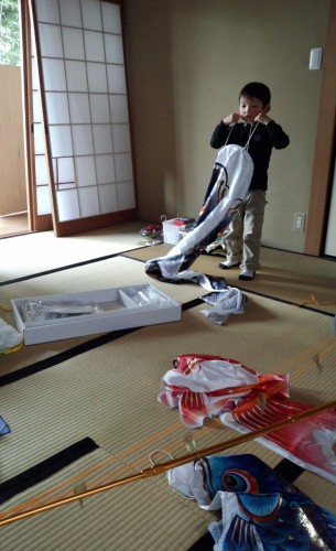 やっとやっと、悠哉が楽しみにしていたこいのぼりを立てました箱から出し始めた途端テンションはマックスこいのぼりの歌を歌いながら自分ですべてのこいのぼりを出し『さやかがおらん』吹流しに、お父さん、お母さん、子供(青色なので悠哉らしい)吹流しは何と言う悠哉に、悩んだ挙句『一番上にあるからお家』と答えると素直に納得『お家よりもお父さんの方が大きいねぇ』だって(笑)彩夏がいない理由は、『彩夏は女の子だからお雛様、こいのぼりは男の子だからいないのよ』というとこれまた納得いつまで通じるか分からないけど、そのうち彩夏も家族だからいるって言われそう組み立てが終わると飾る場所をどこにしようか悩み中ベランダ用なので短いし検討した結果、庭へ通じる扉のところにちょっと強引だし、屋根の関係上低いですが、悠哉は満足そうでこれから毎日『こいのぼり』って言うんだろうなぁ雨の日のお片づけが大変ですが喜んでくれてるからいっかな