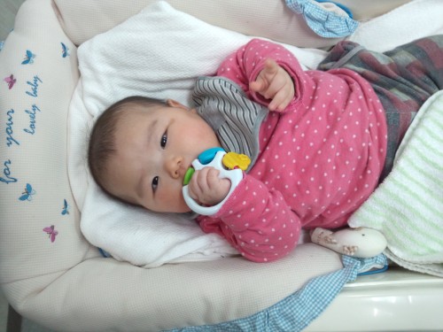 今日で早くも5ヶ月になりました体重が8キロ身長が64センチ と、重た目です悠哉より1センチ低く、700グラム多目ときましたひょえぇぇですでも無事寝返りもするようになったのでこれからは少し運動させないとですねやっぱり女の子なのでスタイル大事です沢山遊んでもらわないと歯固めで遊んだりは得意ですが・・・。このムチムチの太ももは流石なもんでしょ興味も色々出てきたのでいろんな体験をさせたいです今日はスプーンの体験もしました(離乳食はまだ、母乳で)嫌がりもせず口をあけてくれてよかったですでも、ごっくんはまだ下手なのでもう少ししたら始めようと思います