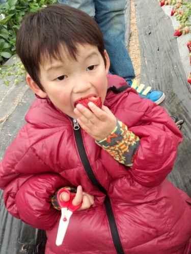 今日はみんなでイチゴ狩りにきました大きいのやら小さいの種類も色々あって、悠哉も自分で摘んで食べてます家ではあまり食べないのに13個も食べてました(∩´∀`∩)フルーツオンリーで食べるの苦手なパパは8個、ママは記録を出そうと頑張り、63個食べたところでパパストップ残念でも、とっても楽しかったですまた行こうね帰りにイカの活き造りを食べて帰り、満足な1日となりました
