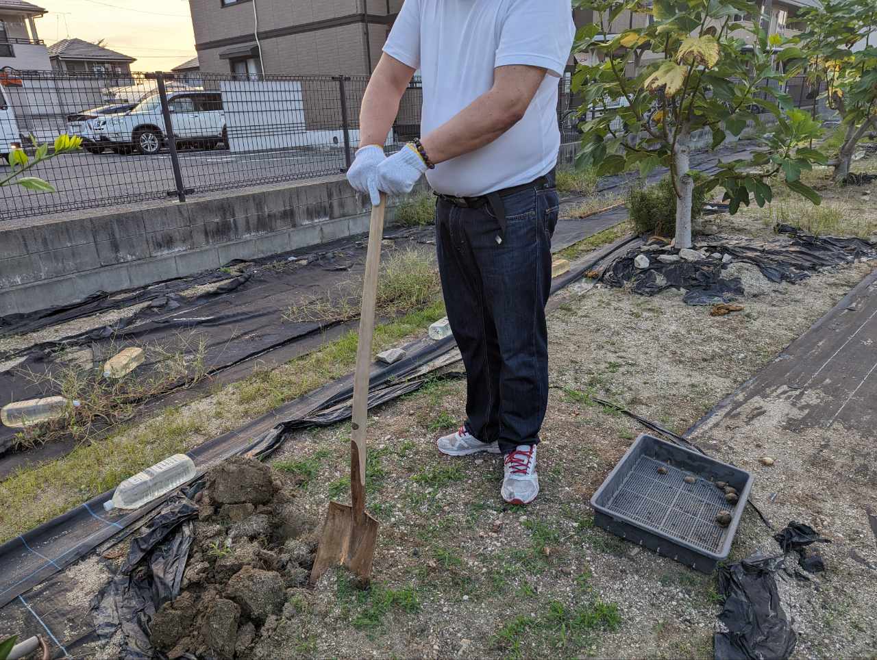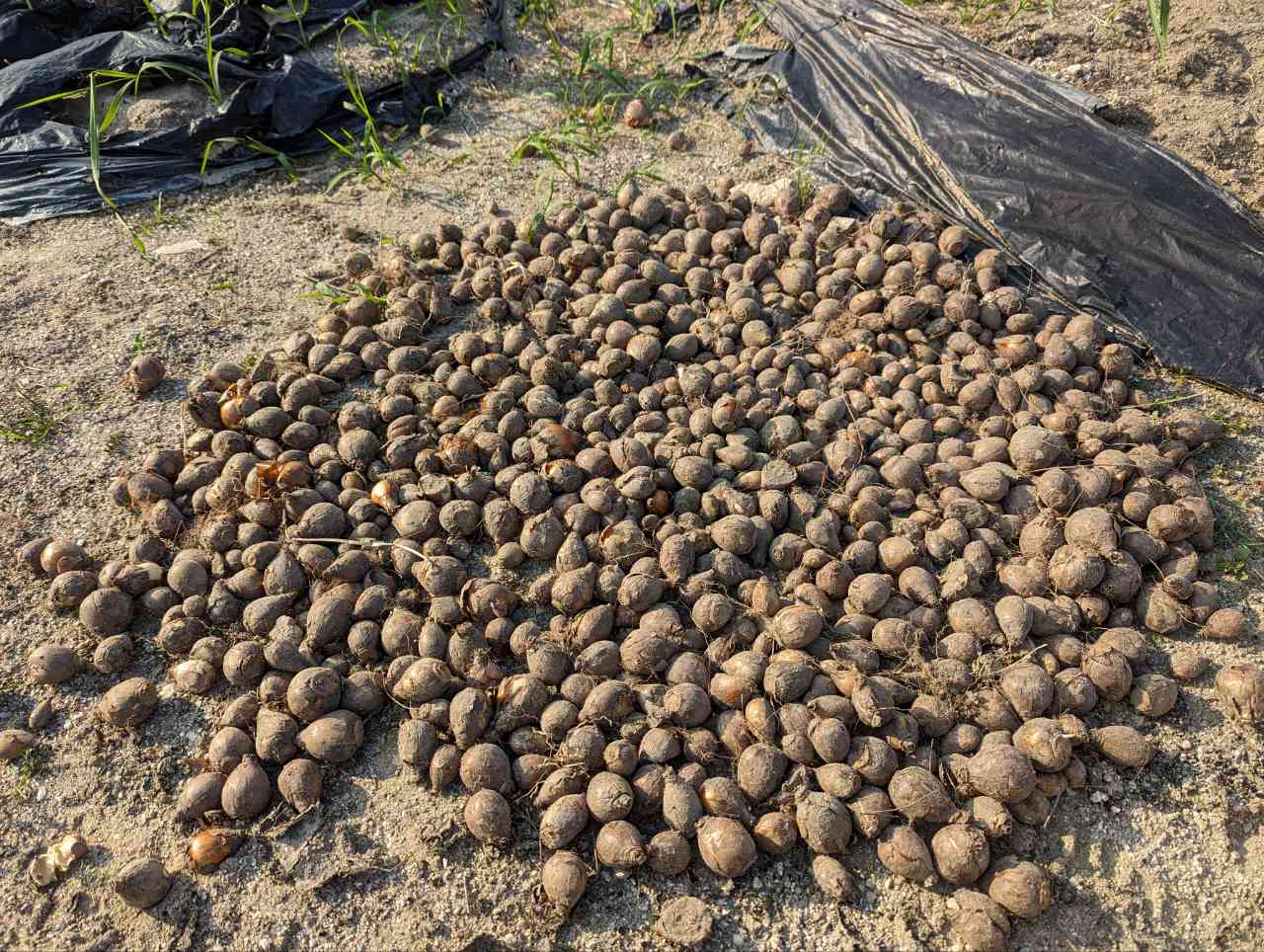 新築予定地にあるビワの木を移植するため、その移植先にある水仙の球根を掘り起こし乾燥させました。大きくてひび割れが起きていないものを選別し、小さなものは廃棄処分します。秋以降に空いた土地に植える予定です。