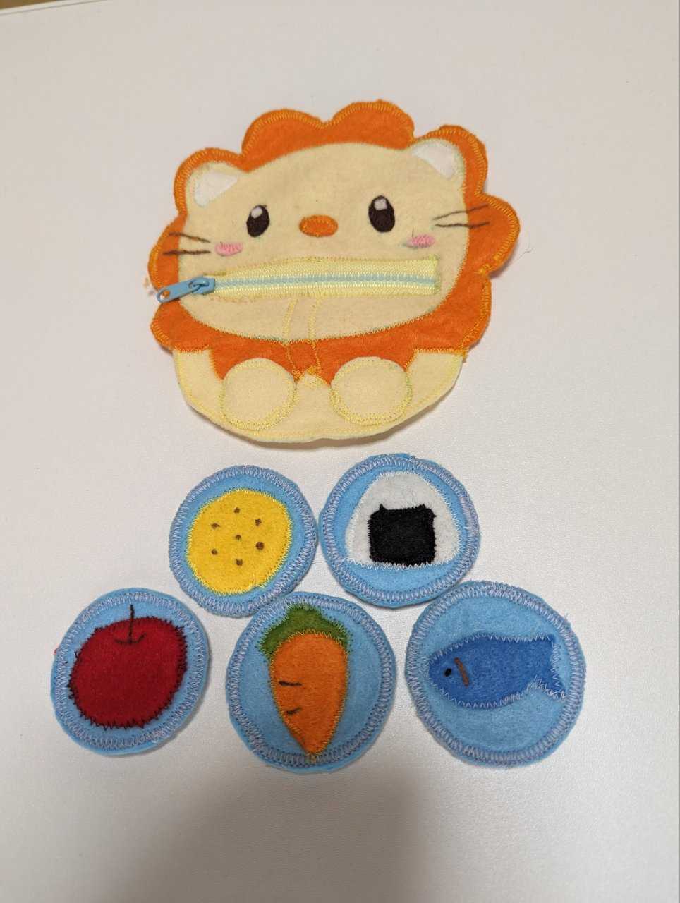 あそべる!まなべる!フェルトのおままごとと知育おもちゃ 【本】図書館で借りた本を見て、ライオンさんのファスナーのアプリコットを作成しました。ちょっとミスってしまいましたが、そのうち上手になるかな?今は時計のスナップボタンを作成完了しました。近々ブログにアップしていきますね。