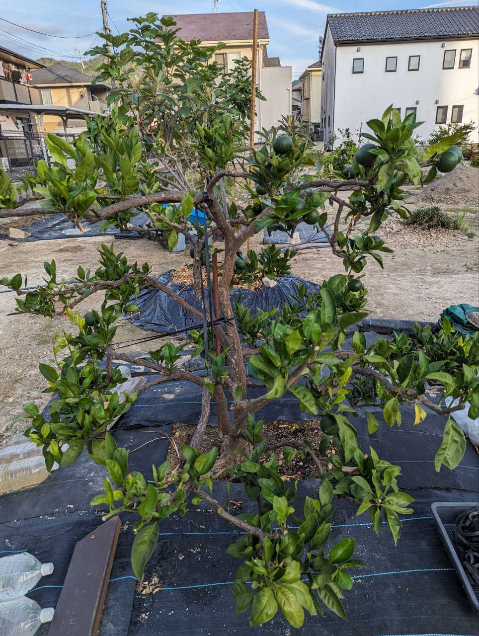 グレープフルーツの実が大きくなってきました。ここの果樹園は売る予定でしたので、手入れをしていなかった結果、3個しか実をつけていません。母が剪定し、来年には多く収穫できるでしょう。