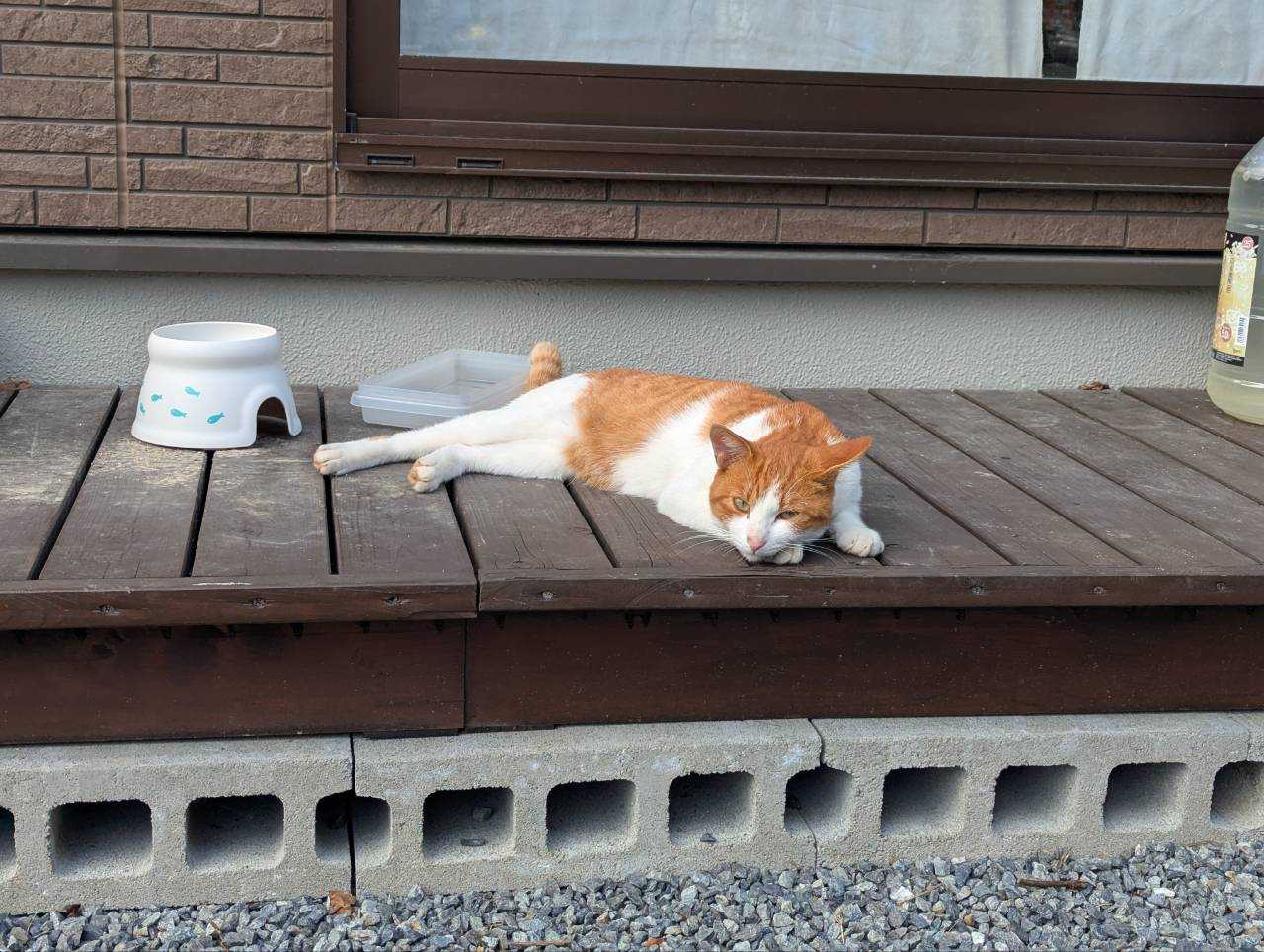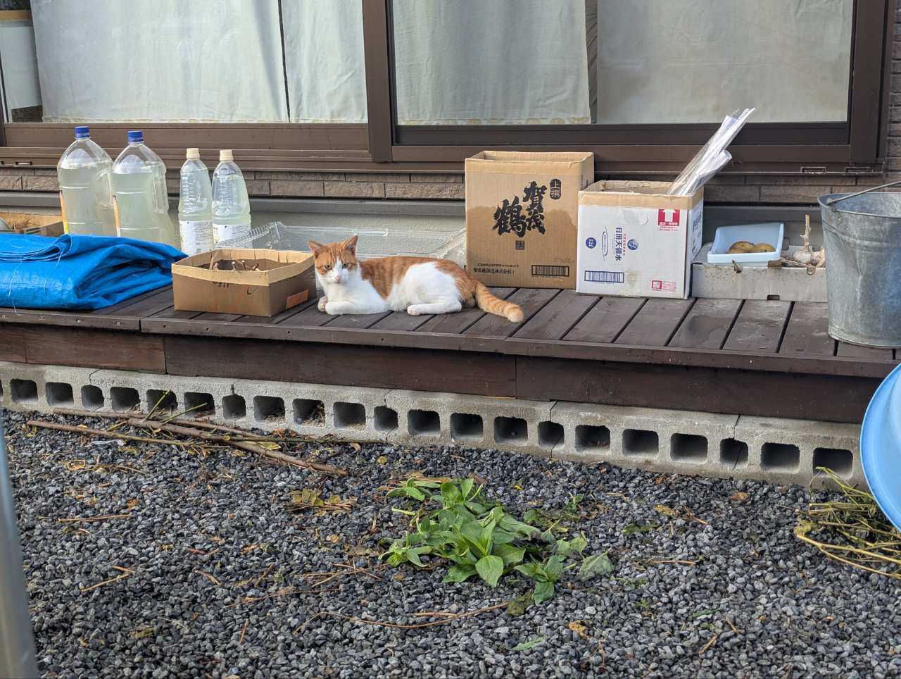 昨晩、猫の喧嘩の声が鳴り響きました。確認するとこの写真に写っている茶トラともう1匹。暗闇でもう1匹は確認取れませんでした。恐らくグレーとこげ茶のフサフサ猫だと思います。縄張り争いが起こりましたが、今後の展開を観察しておきます。茶トラが勝ったのか、翌日の朝からこの猫が農作業スペース付近にたたずんでいます。ライバルの猫に居場所を取られない対策かもしれません。今までは顔合わせすることなくすれ違いだったので喧嘩になることがなかっただけかもしれません。こちらとしては皆仲良くエサを分け合ってほしいところです。この縁側に猫が佇んでいますが、ここは切花の出荷スペースとして利用しているのですが、今日は猫を優先させてあげました。影と一輪車という狭い所を好む猫です。小さな農業小屋の隙間も猫が安心するスペースのようです。癒された猫の状況です。日の光を浴びてまぶしいのでミカンの木の陰に佇んでいます。私は最近ほぼこの茶トラを目撃していますが、なんとか私に懐いてくれないかなとの思いで猫ダンスを猫に向かって上半身だけ踊ったりしています。農作業をしながらですが。。。カープのチアガールが狐ダンスをしている感覚です。これで心を開いてくれたらいいなと思っています。母が近づくとこの茶トラは警戒心が強いので逃げてしまいます。母より私の方に少しは安心したのか、距離感は私の方が近づいてきました。