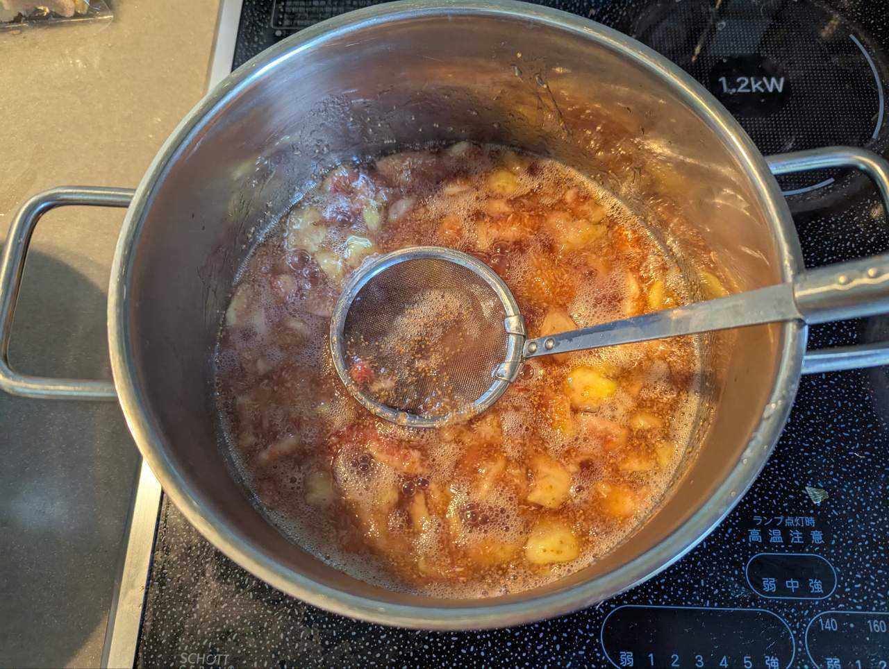 灰汁を取り除き、レモン汁を加えて弱火で煮込み完成させます。