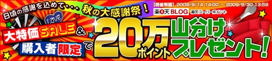 【楽天ブログスタッフ追記 2009年9月30日】本特集は終了いたしましたので、リンク先を削除させていただきました。 こんにちは楽天ブログスタッフです本日14:00こちらの企画をリリースいたしました~~どどんとお得に20万ポイント山分け☆9月30日(水)13:59までの2週間開催です安さバクハツスポーツ用品やインテリアなどの高額商品大特価SALEから、日常のちょっとした雑貨・必需品までお得に揃った20万ポイント山分け企画ですこの機会にぜひ楽天ブログスタッフでした