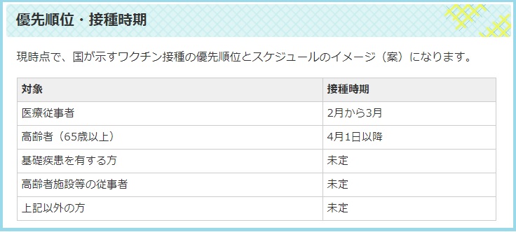 欧米諸国から2カ月遅れで、ようやく日本でも新型コロナウイルス感染に関するワクチン接種が始まりました。ワクチン接種は各自治体が行うそうなので、ヒロくんの場合は住んでいる東京都清瀬市の指示に従うことになります。そこで、清瀬市のホームページを確認したところ、以下のような掲示がありました。「医療従事者」の接種時期が「2月から3月」となっていて、一番初めに接種されることになる医療従事者の皆さんの接種時期もはっきりとはしていないようですね。それから「高齢者(65歳以上)」が「4月1日以降」となっています。残念ながらヒロくんは64歳なので、この分類からは外れてしまいます。医療従事者と65歳以上の高齢者以外の人は「未定」となっているので、いつになるのか分かりませんね。なお、「基礎疾患を有する方」が区分されているので、腎臓病や高血圧などがあるヒロくんは優先的に接種できるかもしれません。基礎疾患があるかどうかについては、どのようにして調べるのか、個人情報ですから自己申告になるのか、その方法も分からないです。ちなみに、ワクチン接種には副反応というのでしょうか、いろいろと不都合なこともあるらしいですから、ちょっと怖い気もします。また、ワクチンを接種すれば絶対にコロナに感染しないというわけでもありませんから、悩ましいところではありますが、やはり感染のリスクを考えると接種したほうが良いかと思います。なお、清瀬市ではワクチン接種の準備が整い次第、「接種券」なるものを送付するそうですが、具体的なことは公表されていません。それにしても、接種予定のワクチンは欧米の製薬会社からの輸入ですが、日本の製薬会社では造れないのでしょうか、ロシアや中国でも自国で造っているのに・・・