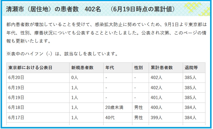 東京都などでは、緊急事態宣言が解除されましたが、新型コロナウイルス感染が収束したわけではありません。感染者は下げ止まりの傾向にありますが、緊急事態宣言を解除したのは東京オリンピックを是が非でも開催したいためではないかと勘繰っています。そんな中、ヒロくんが住んでいる東京都清瀬市の新型コロナウイルス感染者数が400人を超えてしまいました。なお、清瀬市において感染者数が100人を超えたのは2020年12月6日のことで、それから40日ほど経った2021年1月16日には200人を超えました。200人超えの1月16日から100日ほど経過して4月25日に300人を超えましたが、それから6月18日に400人となり、300人から400人まで54日だったことになります。200人から300人までは約100日かかりましたが、300人から400人までは54日ですから、感染のスピードが速まったわけですね。ちなみに、清瀬市の人口は約7万5千人ですが、全国の都道府県で最も感染者が少ないのは鳥取県の466人です。清瀬市の感染者数とは66名の差ですから、あまり差が無い人数ですが、その鳥取県の人口はおよそ55万人ということですから、7万5千人の人口の清瀬市とは桁が違います。鳥取県に比べて、清瀬市のほうが圧倒的に感染者の割合が多いということになり、感染率にはかなりの差がありますね。個人的には、これから先も感染しないように、より一層、手洗い・うがいを励行したいと思います。