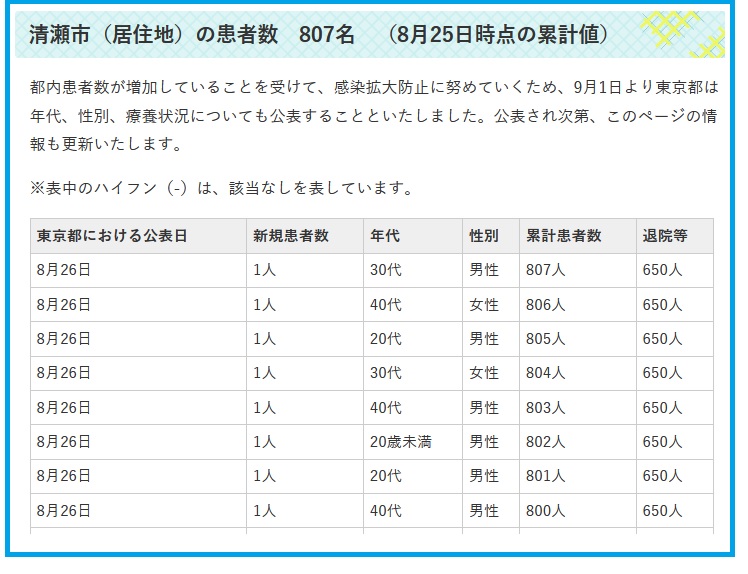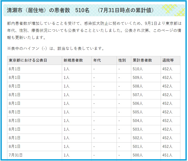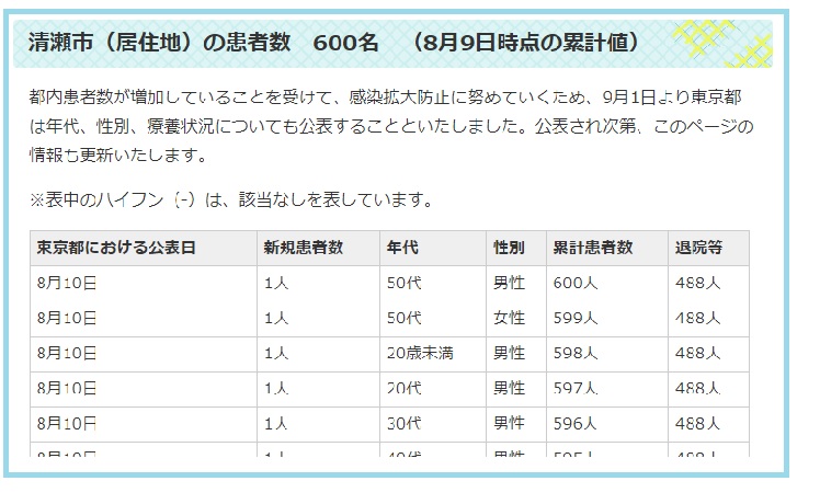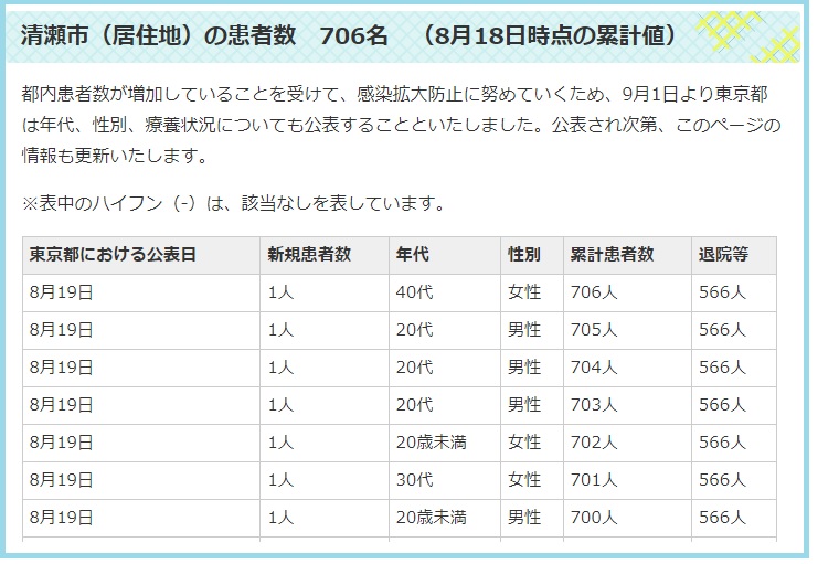 新型コロナウイルス感染者が爆発的に増加しており、東京オリンピックに続いて、パラリンピックも無観客になりましたが、当然のことでしょうね。東京都をはじめとして全国各地で緊急事態宣言やまんえん防止等緊急措置が発せられていますが、各地で感染者数が増加の一途となっています。緊急事態宣言だけではコロナは防げないでしょうから、もっと厳しい措置をとったほうが良いと考えられます。そんな中、ヒロくんが住んでいる東京都清瀬市の新型コロナウイルス感染者数が、瞬く間に700人を超えてしまいました。500人を超えたのは7月31日でしたが、その後600人になったのは8月9日、それからわずか8日ほどで100人もの人が、新たに新型コロナウイルスに感染し700人になってしまいました。人口が7万5千人ほどしかいない清瀬市で、わずか8日ほどで100人も感染者が増加するとは恐ろしいことです。次第に感染のスピードが速まってきて、100人単位でみてみると感染者が増えるまでの期間はとても短くなって、感染のスピードが極端に速まった感じです。ワクチン接種が進んでも感染者が増え続けている状況を菅首相はどう思っているのでしょうか?馬鹿のひとつ覚えみたいに緊急事態宣言を発出しているだけでは困りますよね。個人的には、既にワクチンは2回接種したので、感染しないように、より一層、手洗い・うがいを励行するしかないので、引き続き実行するしかないですね。