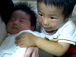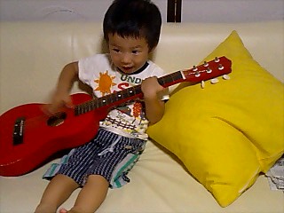 1週間も吸入に通ってるからすっかり慣れっこです(慣れてちゃいかんね・・・(;-_-;))テーブル奥の魚の置物も一人でスイッチON☆ 看護婦さんに褒められて得意げな息子私がちょっと触るだけで『一人でできるから触らないで!』って言いたげに 怒ってきます・・・ あんまり得意気にやってるもんだから『もう一回やってく?』って 吸入をおかわりして帰ってきました 今日は久々の保育園でも調子が良かったらしく咳込むことは無かったようです 明後日 もう一度 診察してもらって良ければ完治かな♪ **************************** 『 ねーね だーちゅく! 』(ねーね 大好き!) 大好きなねーねが ピアニカを弾いて見せてくれると 『ちょーだい!ちょーだい!』 凄い力で引っ張ります・・・(;-_-;) もちろん勝てる訳がなく 悔し泣き・・・(ノ。<,))))... この後 ねーねが吹いて 鍵盤を叩かせてもらってご満悦 ありがとう♪ねーね 服がテロテロになっちゃたね・・・ごめんね。 弟がバトルを見かねてギターを貸してくれました 将来ミュージシャン!?息子にとって初めてのギター!良い音でした♪家で触ってるウクレレとはえらい違い! ギター弾けるようになったらブルーハーツのラブレター♪コピってね☆