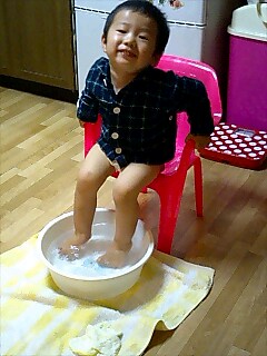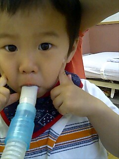 だそうです。 火曜日のお昼に39度の発熱&呼吸が苦しそうだったので救急センターへ。(かかりつけの病院は昼は休診なので)**********レントゲン**********影っぽいモヤモヤはあるけど肺炎ではないですね(じゃぁ何!?) *********血液検査***********炎症の数値が高いですね。昼間の外来なら入院を勧めますがここは救急センターですから。明日、外来で受診して下さい。(イライラ・・・・)『明日は近所の病院に行くから 血液検査の結果をください。』 って帰ってきました。研修医っぽい人で感じ悪かった。問診の時、今飲んでる薬の成分表を書き写してて書き間違いを指摘したのがいかんかったかしら・・・ とりあえず肺炎では無く一安心!? 翌日 いつもの病院へ もともと‘喘息の疑い有り‘の息子風邪がきっかけで、ぜんそく様気管支炎になってしまったようです 朝・夕 一日2回の吸入にせっせと通っています。(朝は仕事があるので、じいちゃん・ばあちゃんが連れてってくれてます。) 熱は火曜日以降は落ち着いてるので昨日から入浴。それまでは、蒸しタオルで拭き拭きそして足湯 気持ち良さそうです♪ 昨日からのお風呂も大喜びで「出るよ!」って言うと『まだ~~~!!!!!』って怒るほど。どんだけ風呂好き!?静香ちゃん?? まだちょっと興奮するだけで、せき込んでます・・・はやく元気になってね☆