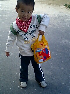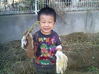 保育園の遠足ですこの日は お散歩の後 園庭でお弁当を食べたようです多すぎたかな?って心配したけど空っぽになって帰ってきました(^_^)V この日から 家の中でも お弁当箱を持って お散歩ごっこがブームになりましたせっかくだから お弁当持って おいも掘りに行くことにしましたあ~した天気に な~あれ!! 晴れたよ~~=^∇^*= 三重県の多度町まで行きました 掘れる! 掘れる!!☆初めてのおいも掘り☆こんなに沢山掘りました^m^ 『ここで焼き芋できるって聞いたんですけど~』と おっちゃんに言ったら『???』と変な顔されたけど図々しくも焼き芋させてもらいましたお芋を洗って濡れ新聞にくるんで アルミに包んで パパが火の番してる間に・・・お弁当タイム♪どれどれ・・・・ほくほくで 美味しかったです(^_^)V 人が少ないし ビニールハウス型の日よけの中で机といすでお弁当たべれるしボール遊びができるくらいの空き地もあるし・・・ここは毎年恒例で行かなくちゃ!!とパパママも大満足でした 帰り道に気付いたんですが最初に行く予定だった『掘った芋で焼き芋を!』の畑は別の畑でしたσ(^◇^;)そりゃ~『???』って顔されるわな。。。 帰ってからは さつまいもチップスを作りました『うまーい!』と食べてくれたけど 油食べてるみたいでした・・・ お料理は 苦手なんです↓↓↓↓ ・・・・ って 事で 皆におすそわけ~芋売り中これで実家までキコキコ頑張りました 何回も芋が転げて 着くころにはボロ芋になってました