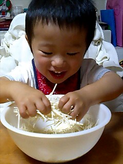 保育園の先生にも『おしゃべりが大好きで日に日に言葉が増えてますね~』って言われるくらいおしゃべりが好きな息子 夕飯のお手伝いで冷麦を粉々にしてもらってるとパキパキ割れる感触と音が気に入ったようで・・・『おもちろーい!!』はじめて聞いた言葉にびっくりして『今おもしろいって言ったよね!』って息子に聞いちゃったσ(^◇^;) お料理してる間 息子もお料理してました こぼれたら拭けばいい・服が濡れたら洗えばいいって何も気にしない私・・・妹にビックリッ!されるけど・・・変!? *********家庭菜園********** 思ったよりも大きくならんなぁ・・・肥料が足りないかしら!?と追肥しました実はこんな感じ↓↓ 『大きくなぁれってお願いしとこか』って声を掛けたらいきなり お祈り始めました!(◎◎;)真剣!!!! 祈りが通じるといいね♪ ********場所が変われば・・・*********スベリ台をキッチンに持ってくると20分くらいひたすら滑り続けてましたいつもと違う場所に置くだけで新鮮なんだね~大満足♪*******チャリンコ候補******** 今のとこコレが候補色は悩み中・・・(カゴが気に入らない・・・変えれんのかな) 息子は後ろに乗せることに決めましたプラ製かスチール製かで悩んでます・・・って、悩みすぎ!?いつになったら決まるんだぁ(T△T) でも、楽しい♪