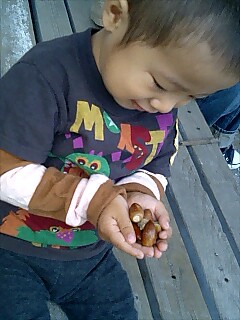 ドングリを見つけると『ごんごり~~~!!』と拾い集めますドングリ拾いって なんでこんなに楽しいんだろう=^∇^*= 落ち葉拾いも大好き☆ 拾ったら おままごと♪『これは~ぱぱの。 これは~ままの。』かわいいなぁ~~男の子でも おままごと大好きな息子です 季節外れのかたつむり 発見!! ♪でーんでん むーちむち かっぷっぷりー♪(でんでんむしむし かたつむりー)上手に最後まで歌えるようになりました ♪げんこつまやのーたぬぬしゃんー♪など 上手に発音できてないとこが かわいさ倍増!! 私の一番のお気に入りは 『食いしん坊おばけ』 ♪食いしん坊のお化けの子夜中にこっそり出できて冷蔵庫のドア開けて四角いものを つまみ食い♪ って歌なんですが息子が歌うと。。。。 ♪しゅーかんばんの おまけのころーおなかに しょっこいでーてきてーじぇーぞーこーのー どあ あけてーしかくいももを ちゅまらしぇたー♪ 歌詞の内容変わってます(;-_-;) あと 最近変わってきたことは・・・お店やサンごっこをする時に色々な物を引きずってきて 自分の部屋を作ってから 遊びだしますすんごい狭いけど 自分のテリトリーが欲しいお年頃??私も子供のころ よくやったなぁ・・・ これは1か月前に 息子の担任の先生が ご結婚されてお祝いと一緒に渡した絵 アンパンマンに見えなくはない??色は私が渡したから ちょっと描かされた感あり(;-_-;) だけど 昨日 アンパンマンワールドに行った後一緒にお絵かきしてたら。。。私がアンパンマンを描こうと 大きな丸を描くと 『アンパンマン描く~!!』と 続きを描きだしました 悲しげな表情だけど・・・ アンパンマンが描けました 1か月で 成長するもんだね~ これからの 成長も楽しみです☆