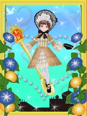 1ヶ月ぶりに、きょうの夕方にお着替えしたのね。●11月7日(月) 夕方:『クラシカルロリータ』特集のフリルドレスでクラシカル系 コスチュームね。 『ハロウィン特集』の魔法のスプーンに乗って空中浮遊中ね。 <楽天アバ ひろみっく(hiromic)> 表に見えてるドレスやボンネットなどは、前回のままなのね。 フレーム『はじめてアサガオ』、『ストロベリーTシャツ』を 獲得したので、使ったのね。『はじめてアサガオ』は、花アルバムのアイテムなのね。花アイテム工場にレシピが公開されて、多くのアバ友さんがさっそく使ってたのね。この機に使わないと、使うチャンス逃しちゃうかも・・・ってことで、あたしもすぐさまお着替えしたかったんだけど、先週はお着替えする時間がとれずに、きょうまで延び延びになってたの。